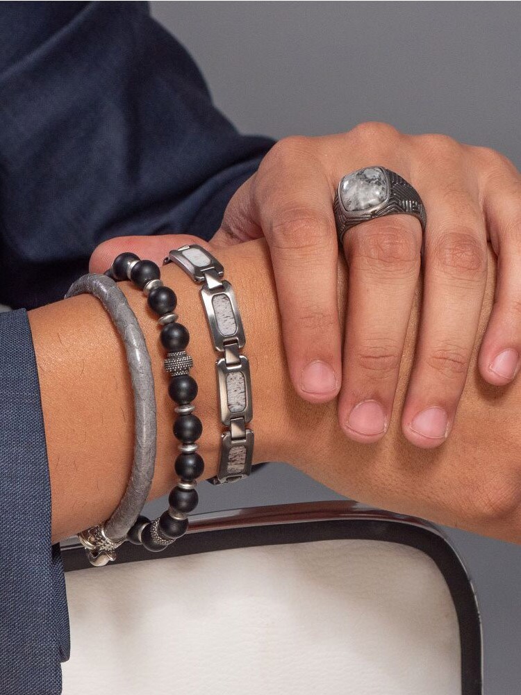 Armbånd med 8 mm matt svart agatstein, kombinert med svarte oksiderte metallperler. Designet med stretchwire for enkel påføring og perfekt passform.