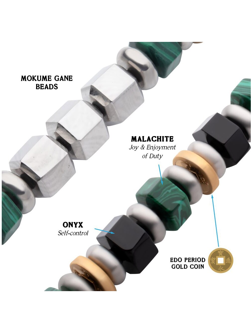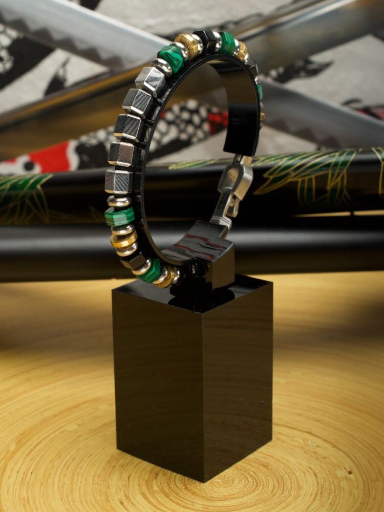 Et eksklusivt armbånd inspirert av den japanske Bushido-tradisjonen. Armbåndet kombinerer den tradisjonelle teknikken Mokume Gane – en unik metallkunst som skaper mønstre som minner om treverk – med vakre edelstener.