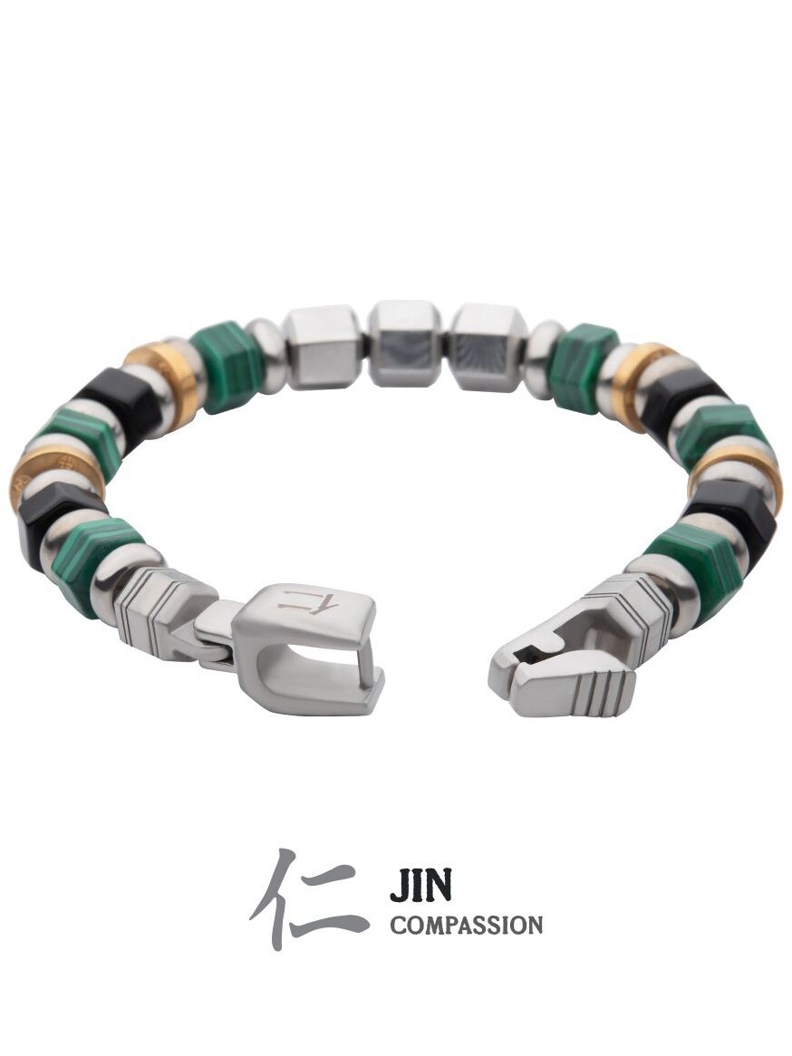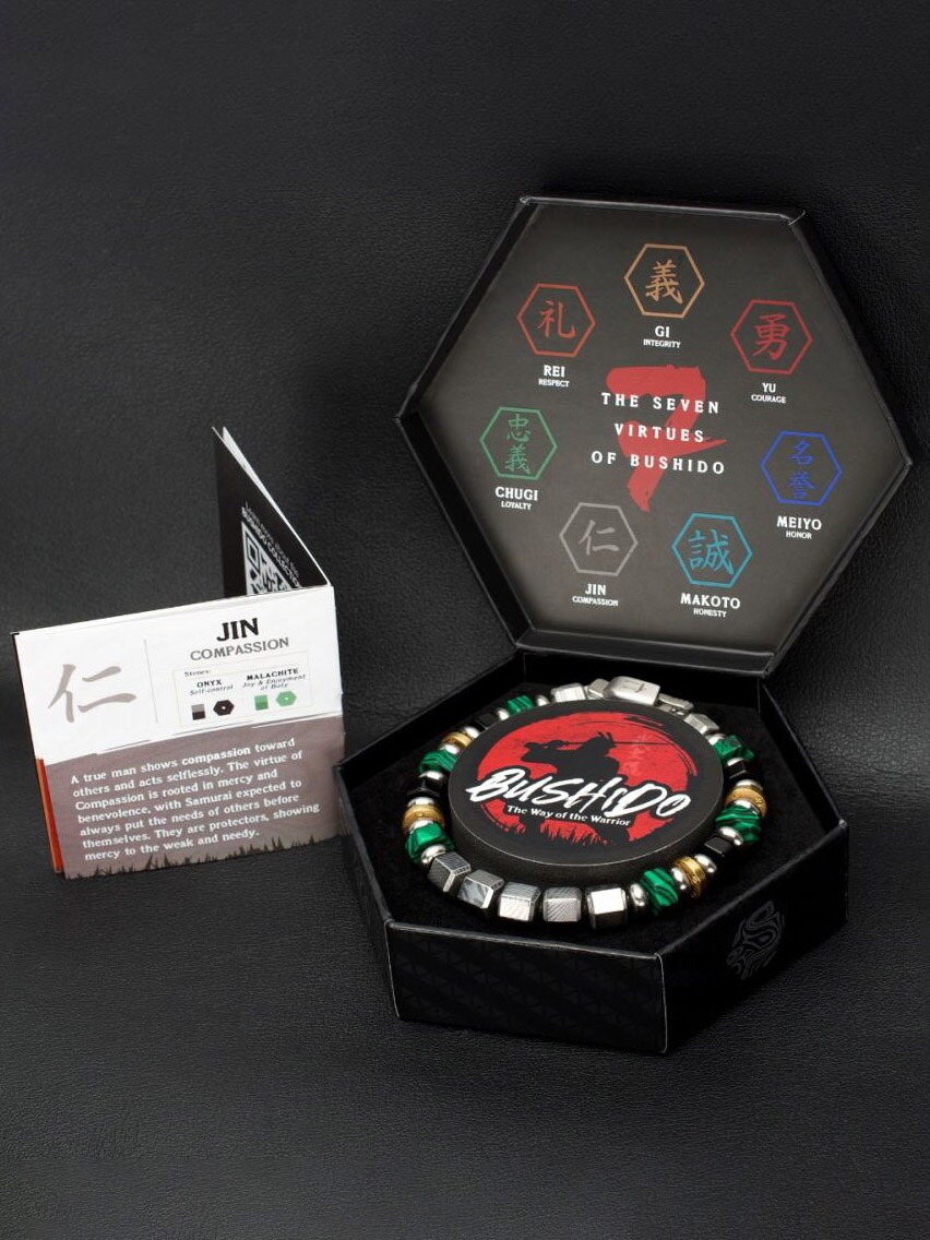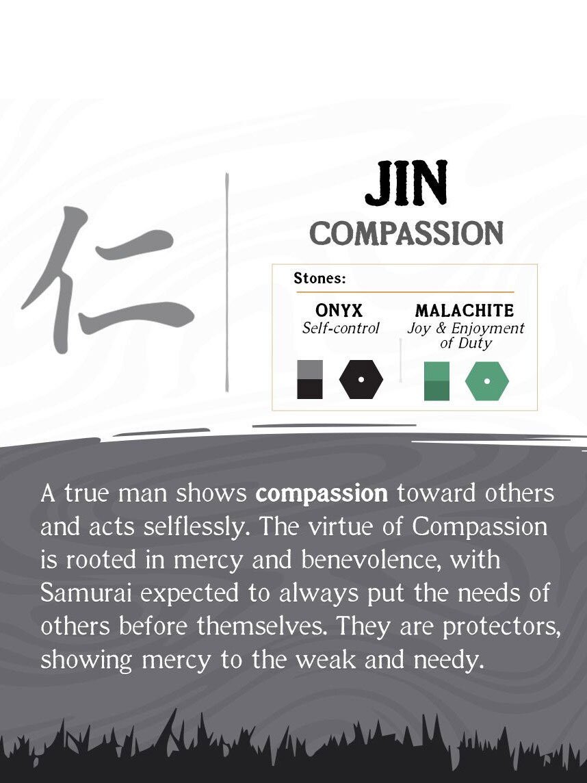 JIN: COMPASSION – En sann mann viser medfølelse overfor andre og handler uselvisk. Dyden medfølelse er forankret i barmhjertighet og godhet, og samuraien forventes å sette andres behov foran sine egne. De er beskyttere som viser nåde for de svake og trengende.