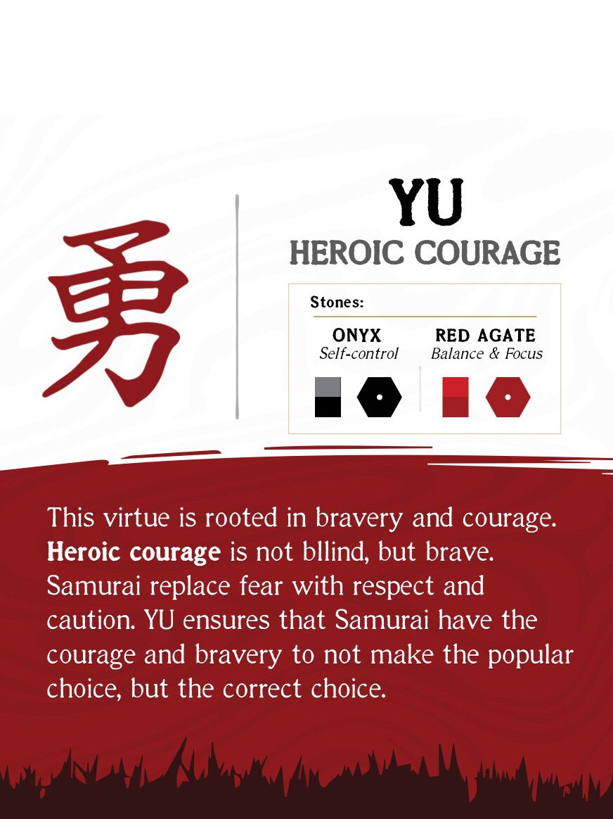 YU: HEROIC COURAGE – Denne dyden er forankret i mot og tapperhet. Heltemot er ikke blindt – det er bevisst. Samuraien erstatter frykt med respekt og forsiktighet. YU sikrer at samuraien har mot til å velge det riktige, ikke det populære.