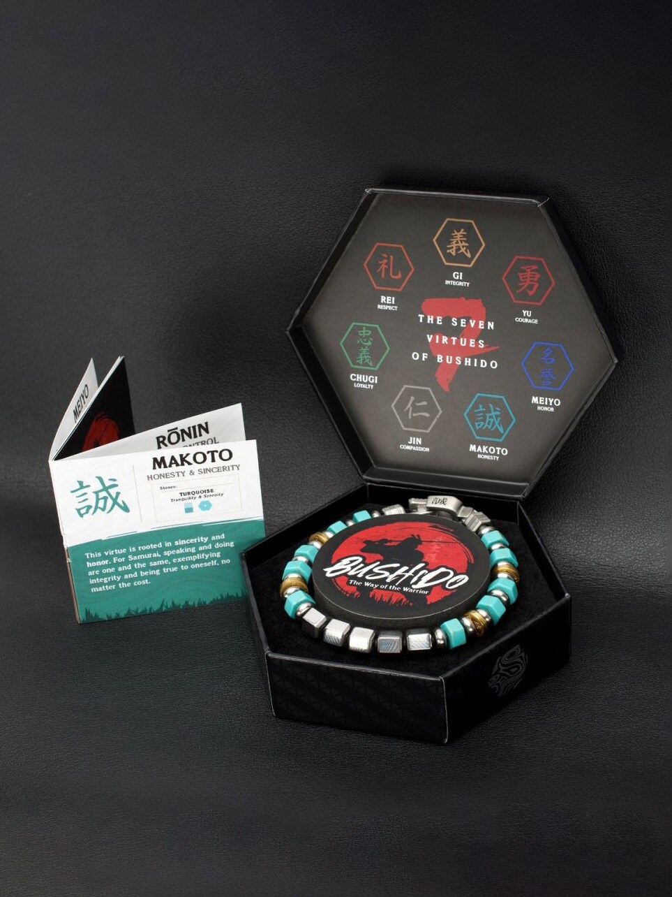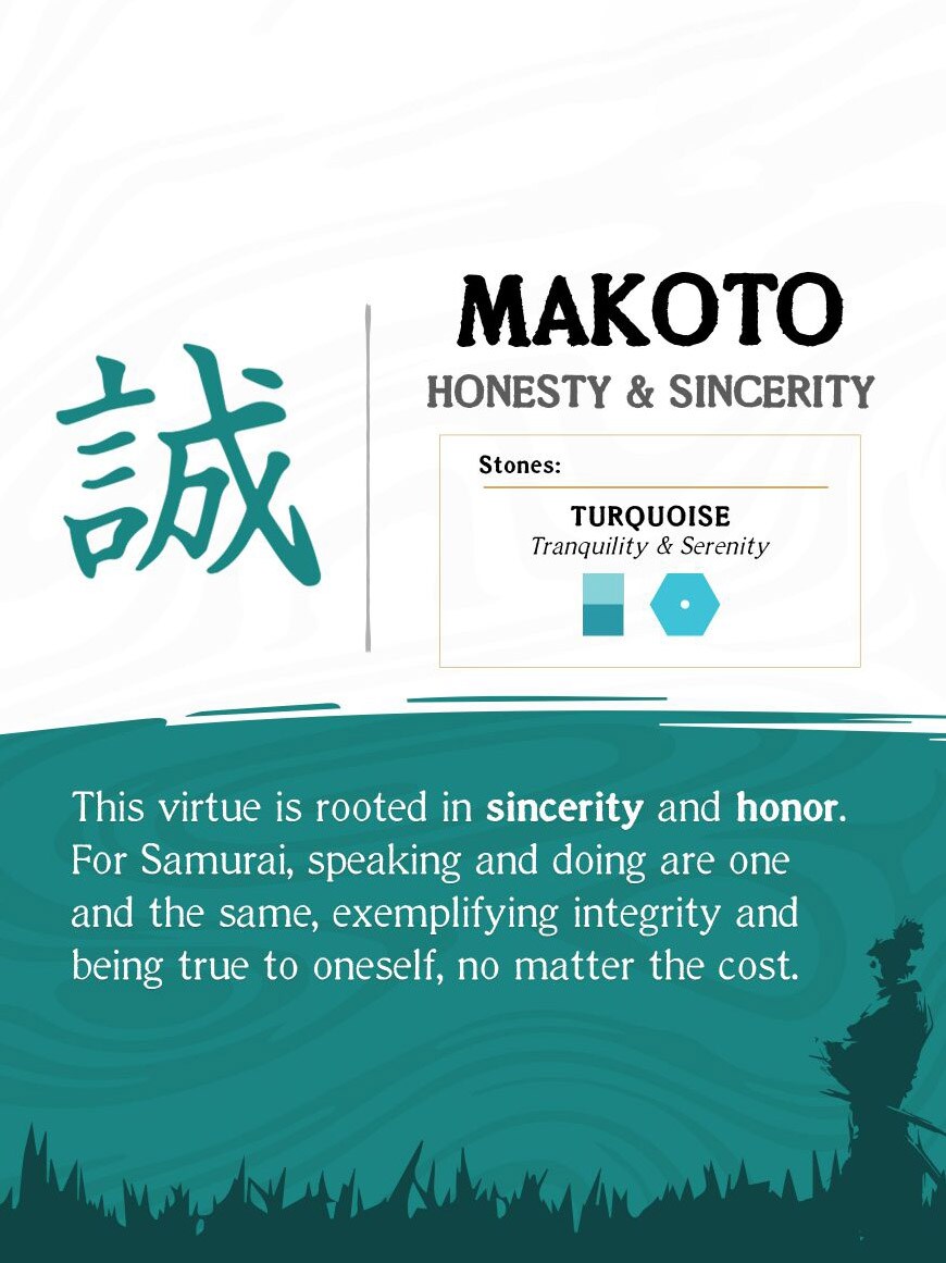 MAKOTO: HONESTY AND SINCERITY – En samurai krever respekt, men vet også at respekt må fortjenes. Denne dyden er forankret i respekt og høflighet, og en mann må lede ved å være et godt eksempel. Ved å vise respekt for andre, speiler han respekten han har for seg selv.