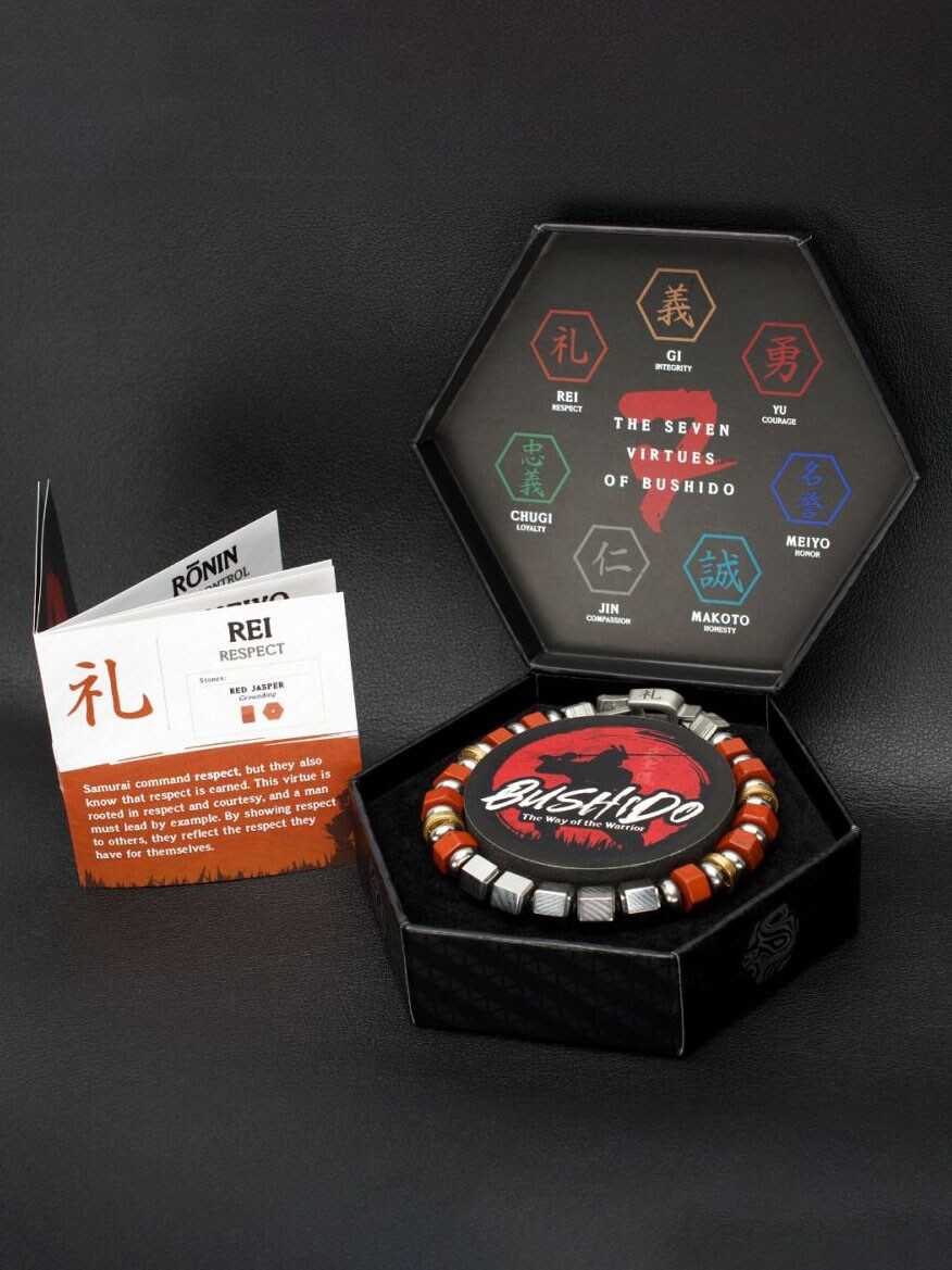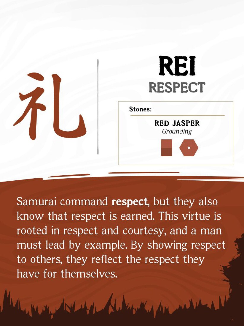 REI: RESPECT – En samurai krever respekt, men vet også at respekt må fortjenes. Denne dyden er forankret i respekt og høflighet, og en mann må lede med et godt eksempel. Ved å vise respekt for andre, speiler han respekten han har for seg selv.