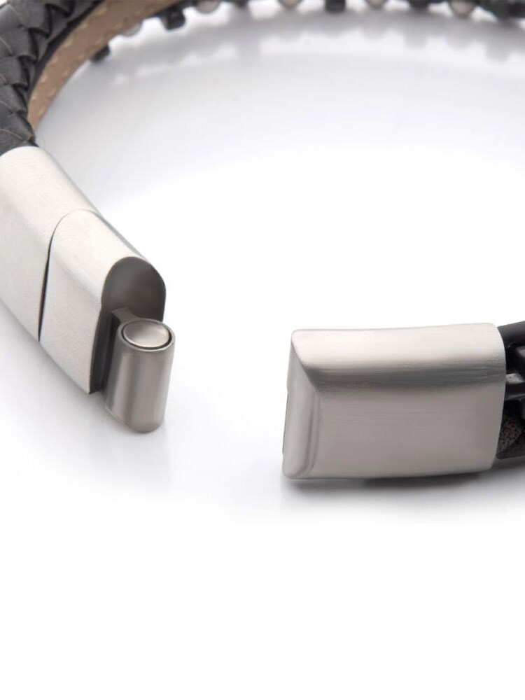 Multistrands armbånd i denimfarget, svart og brunt full grain-kuskinn, kombinert med hematittperler formet som små kors. Armbåndet har magnetlås i stål og en ekstra justerbar lenke for optimal passform. Et moderne tilbehør med både karakter og detaljer som skiller seg ut.
