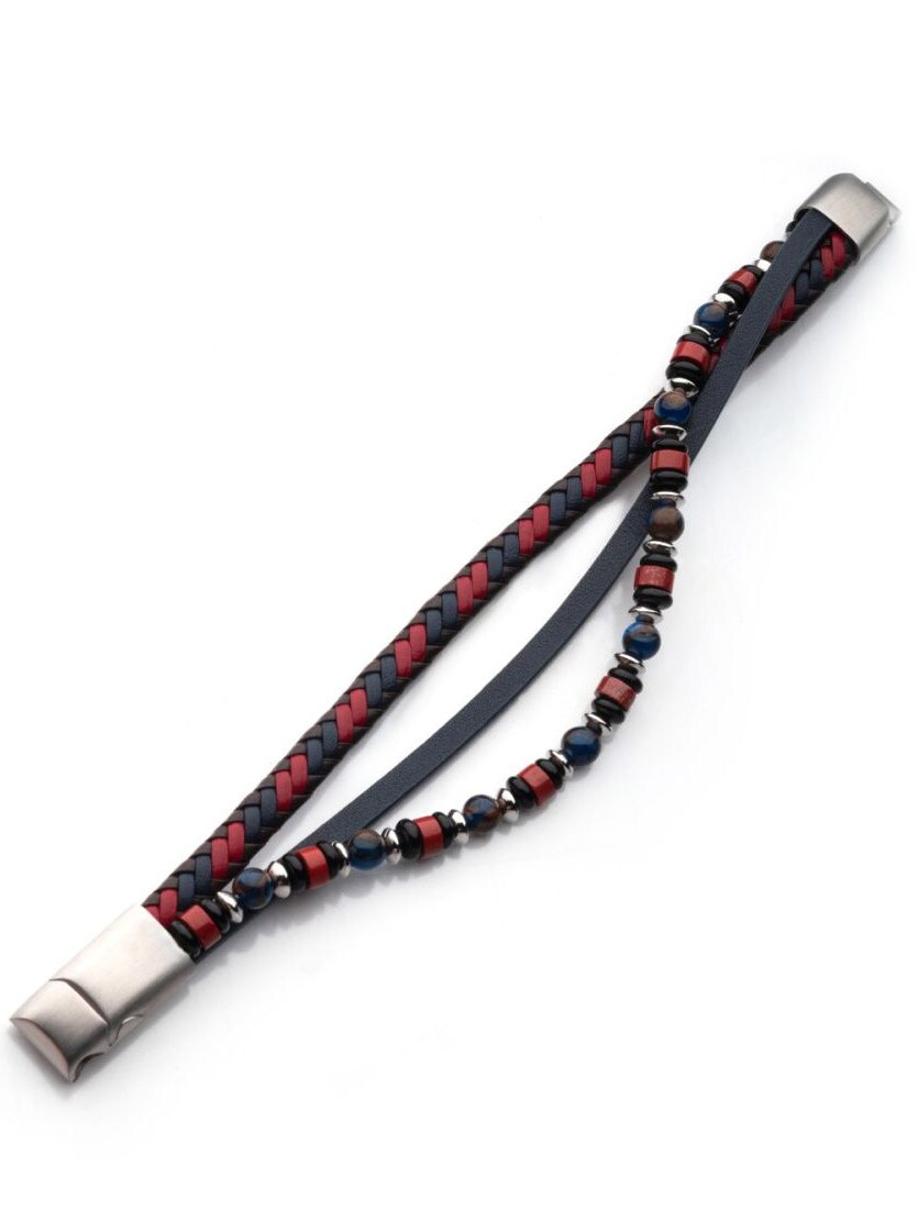 Fargerikt multistrands armbånd i full grain-kuskinn kombinert med perler av sort onyks, blue golden stone og rød agat. Armbåndet har magnetlås i stål samt en ekstra justerbar lenke for perfekt passform. Et moderne tilbehør med både farge og karakter.
