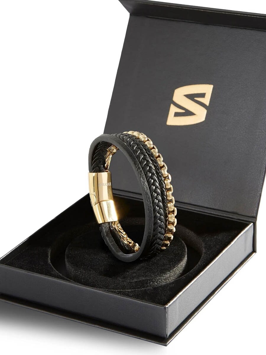 Et karakterfullt armbånd i ekte lær med flere flettede remmer og en lenke i rustfritt stål. Den polerte magnetlåsen gjør det enkelt å ta armbåndet av og på, samtidig som det sitter trygt på håndleddet. Armbåndet leveres også med en ekstra lenke slik at du enkelt kan justere lengden for perfekt passform. Et tidløst tilbehør som løfter enhver stil.