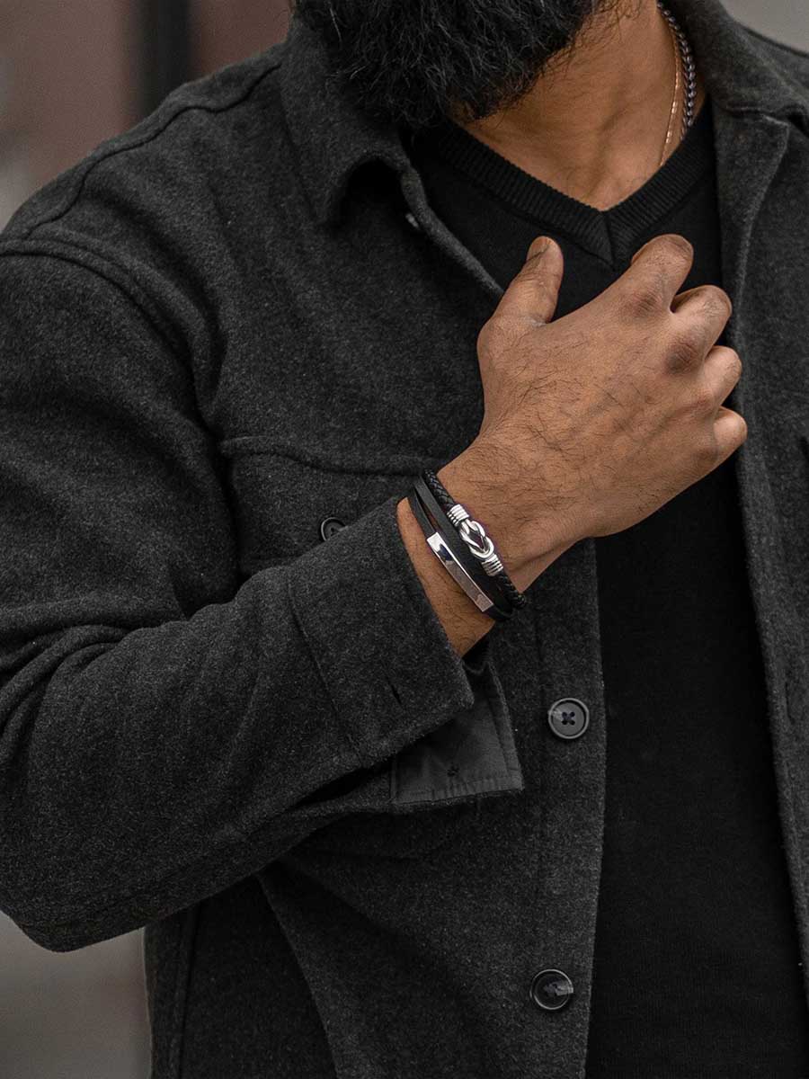 Et elegant armbånd som kombinerer svart ekte lær med polerte detaljer i rustfritt stål. Den sikre magnetlåsen gjør armbåndet enkelt å ta av og på, og den medfølgende forlengerlenken lar deg justere lengden for optimal passform. Designet balanserer klassisk stil med moderne attitude – perfekt både til hverdags og fest!