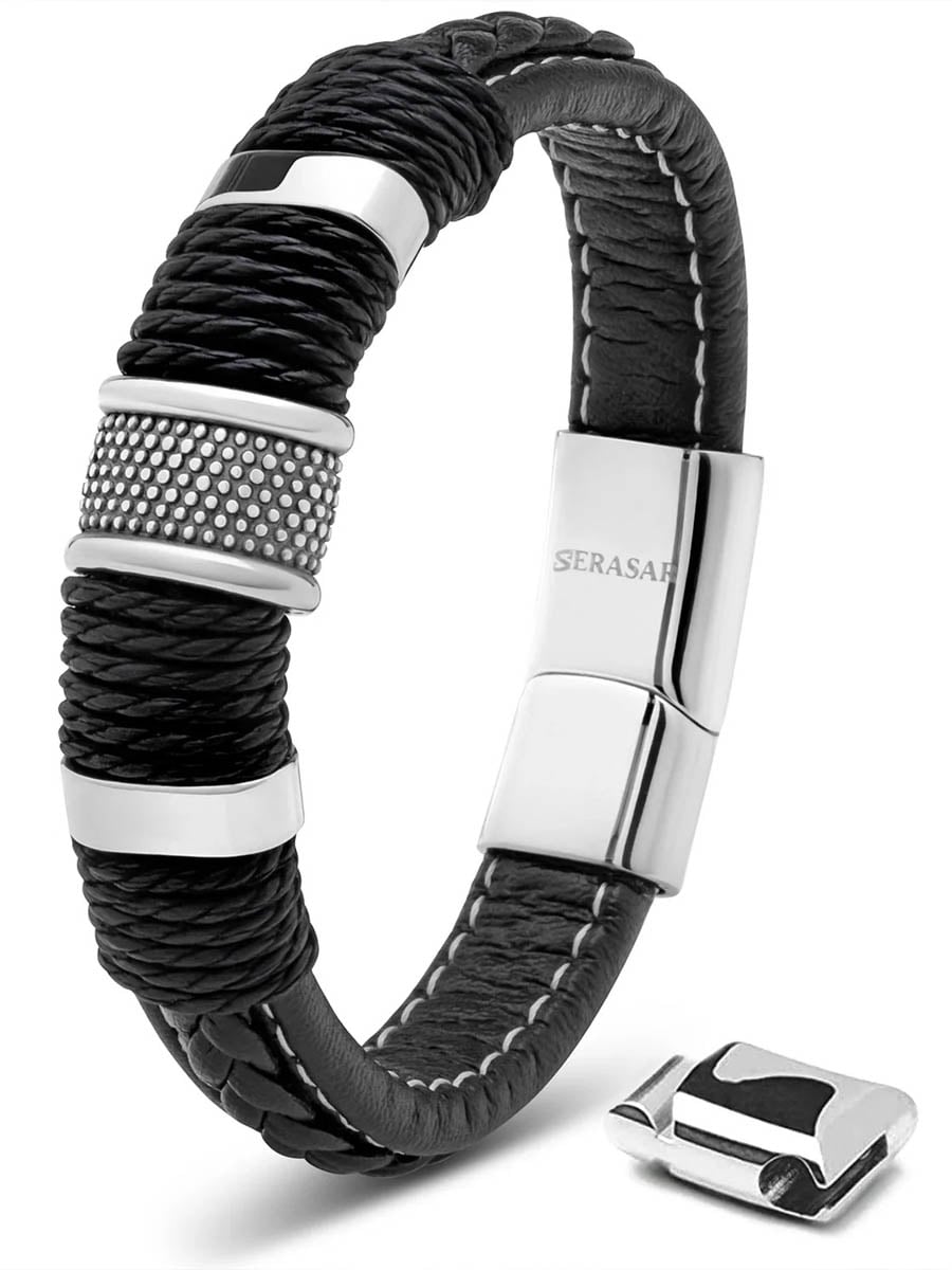 Et kraftfullt armbånd som kombinerer flettet skinn med detaljer i rustfritt stål for et moderne og robust uttrykk. Låsen er enkel å håndtere med én hånd, og armbåndet leveres med en ekstra forlengerlenke slik at du enkelt kan justere lengden til ønsket passform. Et stilfullt tilbehør som løfter enhver outfit.