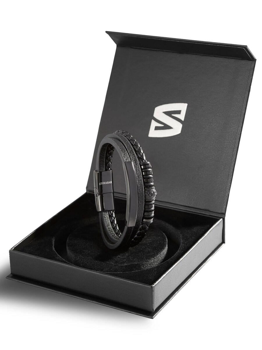 Et elegant armbånd som kombinerer svart ekte lær med polerte detaljer i rustfritt stål. Den sikre magnetlåsen gjør armbåndet enkelt å ta av og på, og den medfølgende forlengerlenken lar deg justere lengden for optimal passform. Designet balanserer klassisk stil med moderne attitude – perfekt både til hverdags og fest!