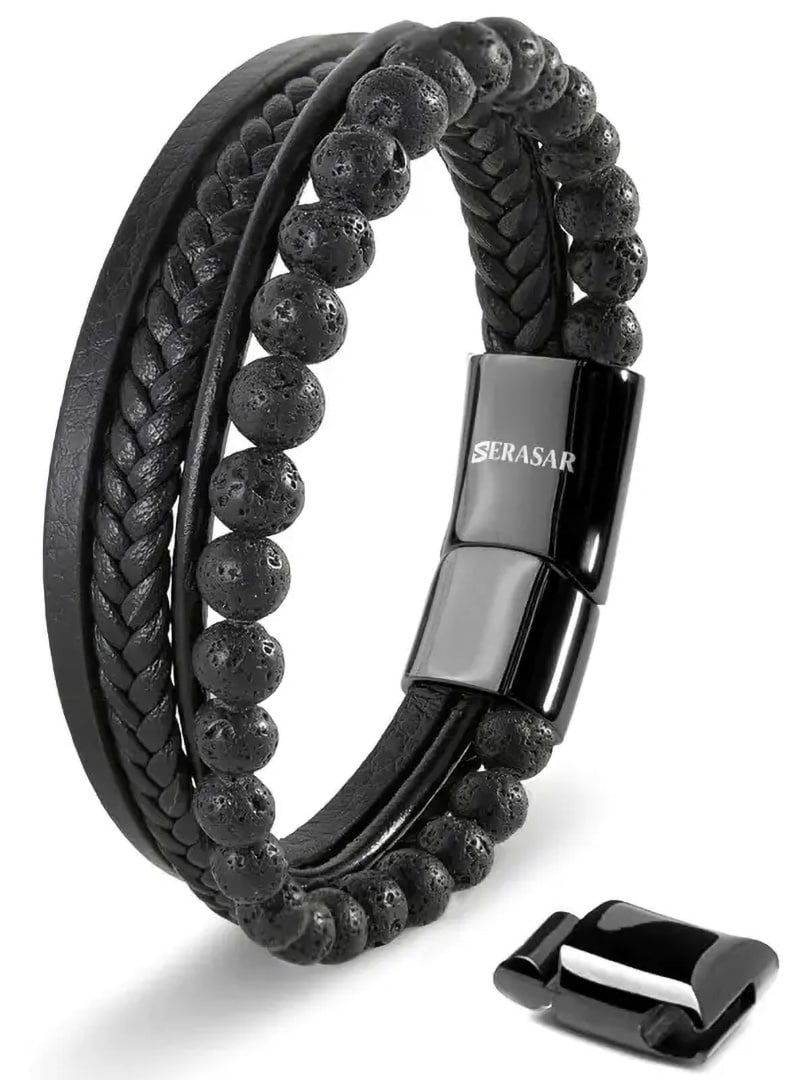 Et stilfullt armbånd som kombinerer flettet lær med matt svarte lavasteiner for et moderne og kraftfullt uttrykk. Den polerte magnetlåsen i rustfritt stål gjør armbåndet enkelt å ta av og på, samtidig som det sitter sikkert. Leveres med en ekstra forlengerlenke for justerbar lengde og optimal passform. Et sofistikert tilbehør som passer både til hverdags og fest.