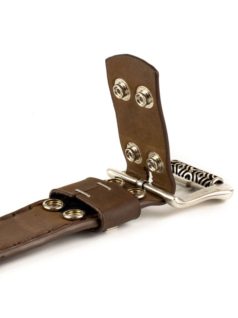 Et kraftfullt og stilfullt belte med tydelig westernkarakter. Laget av robust, brunt lær og dekorert med pregede mønstre samt antikkfargede metalldetaljer som gir et distinkt og eksklusivt uttrykk. Et perfekt tilbehør for deg som vil gi antrekket en personlig og røff edge!