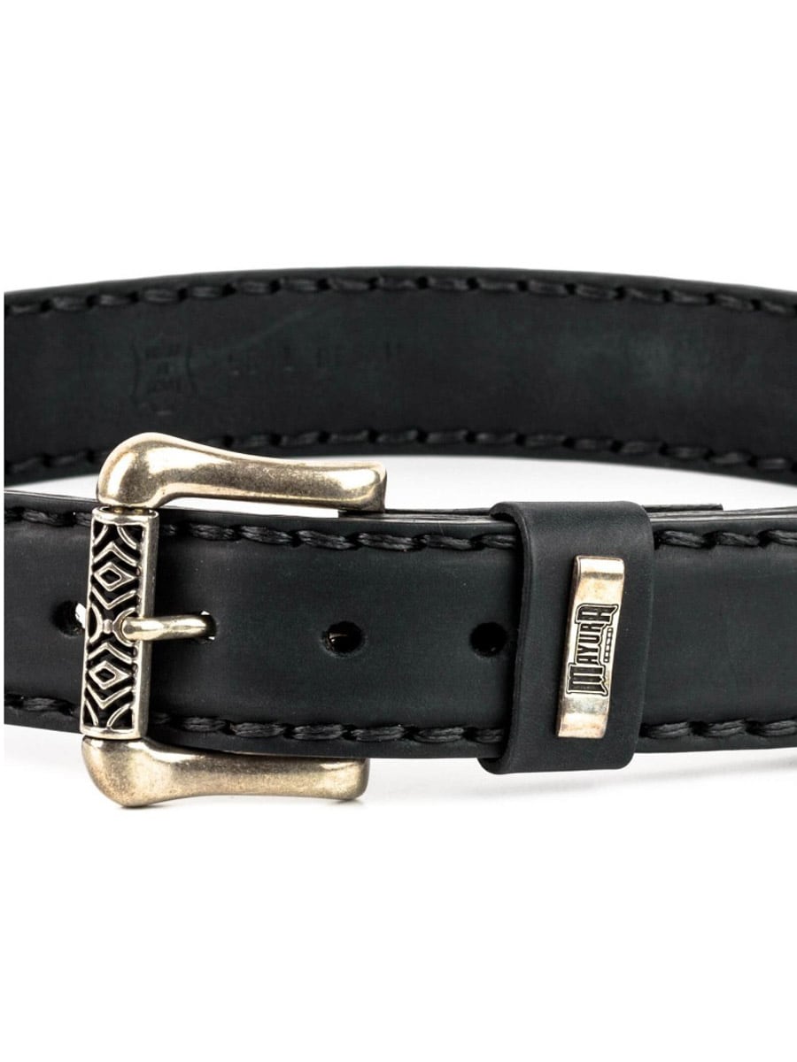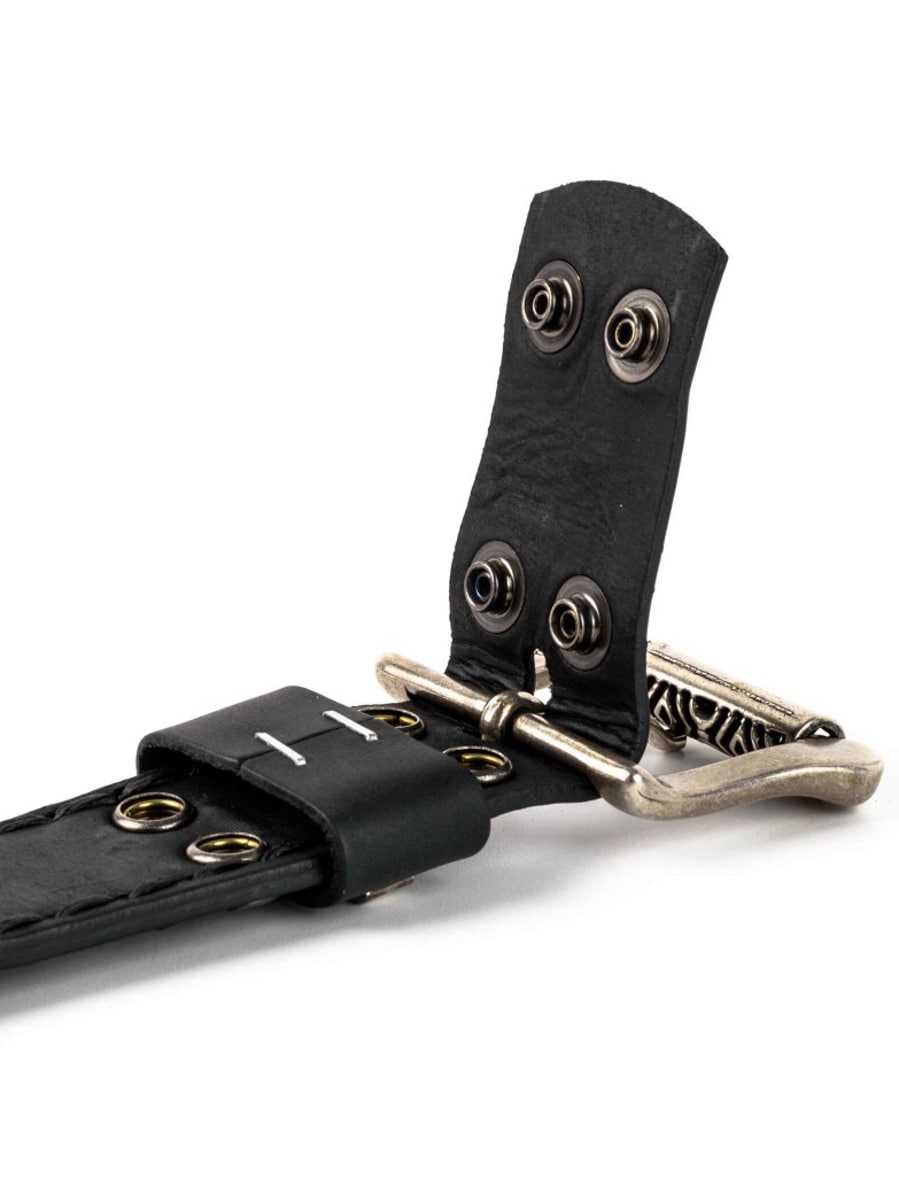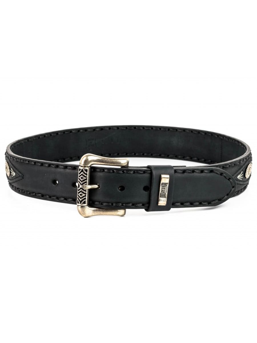 Et kraftfullt og stilfullt belte med tydelig westernkarakter. Laget av robust, svart lær og dekorert med pregede mønstre samt antikkfargede metalldetaljer som gir et distinkt og eksklusivt uttrykk. Et perfekt tilbehør for deg som vil gi antrekket en personlig og røff edge!