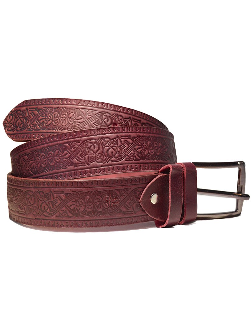 Et karaktersterkt belte i ekte lær, dekorert med et preget vikingmønster som gir en tydelig og kraftfull stil. Det robuste metallspennet kompletterer designet og gjør beltet til et perfekt tilbehør for deg som ønsker å tilføre antrekket et unikt, nordisk-inspirert detalje!