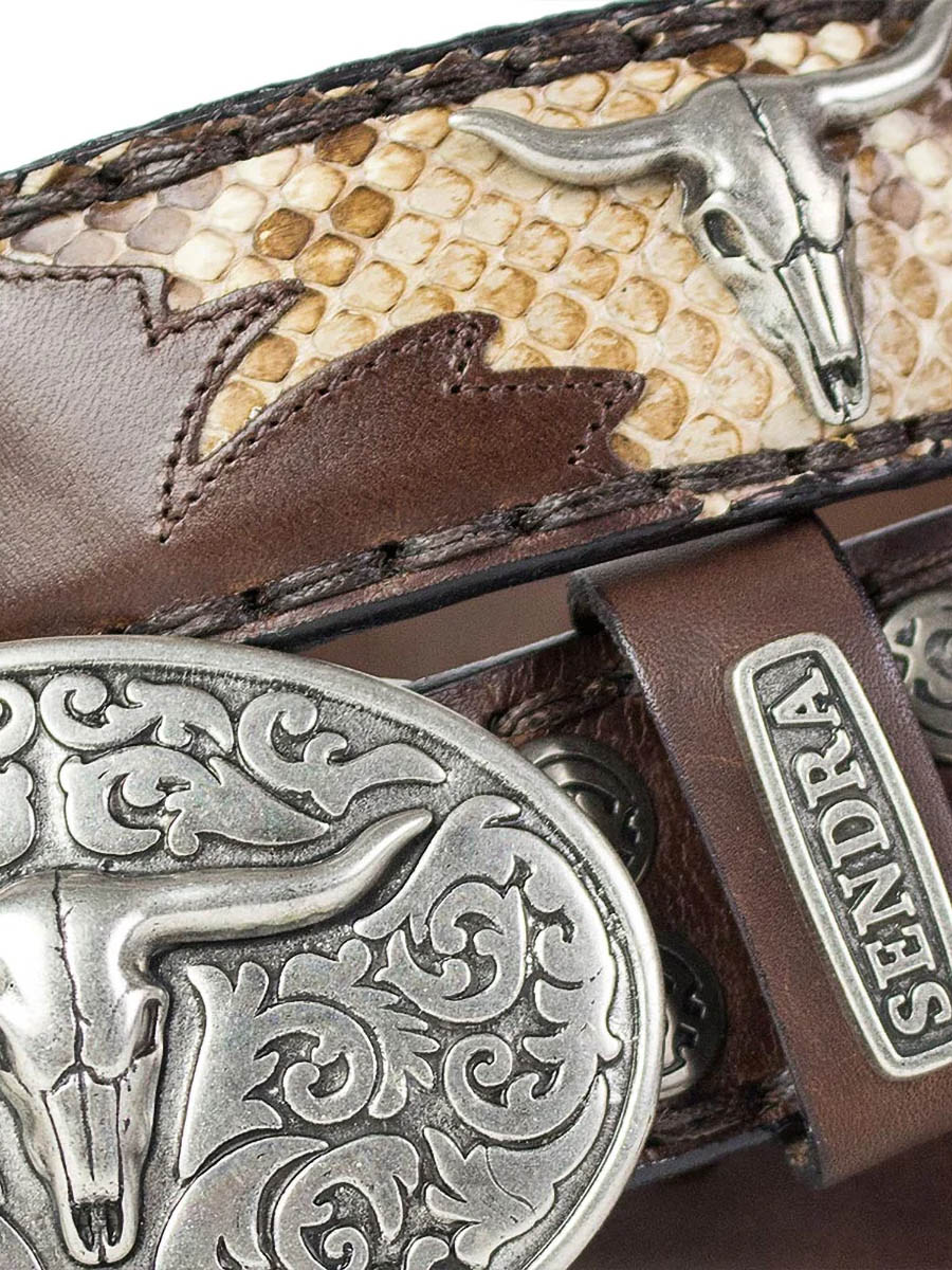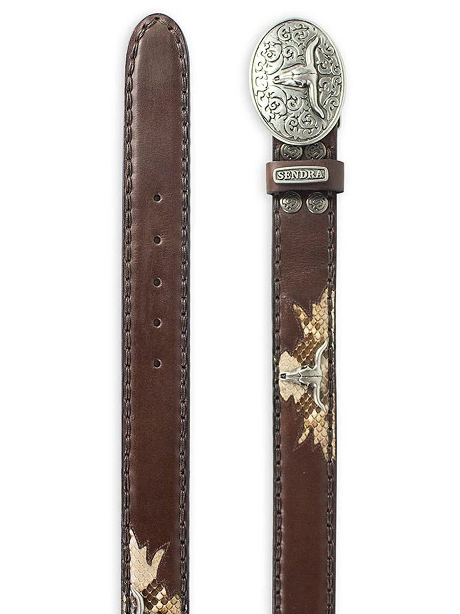 Et premiumbelte for deg som ønsker et tydelig westernuttrykk med en luksuriøs finish. Beltet er laget av høykvalitets brunt lær og dekorert med innfelte detaljer av naturlig pytonskinn, som gir en unik struktur og karakter. De detaljerte metalldekorasjonene og det ovale spennet med longhornmotiv forsterker den rustikke cowboystilen Sendra er kjent for. Et perfekt tilbehør til både jeans og cowboyboots!