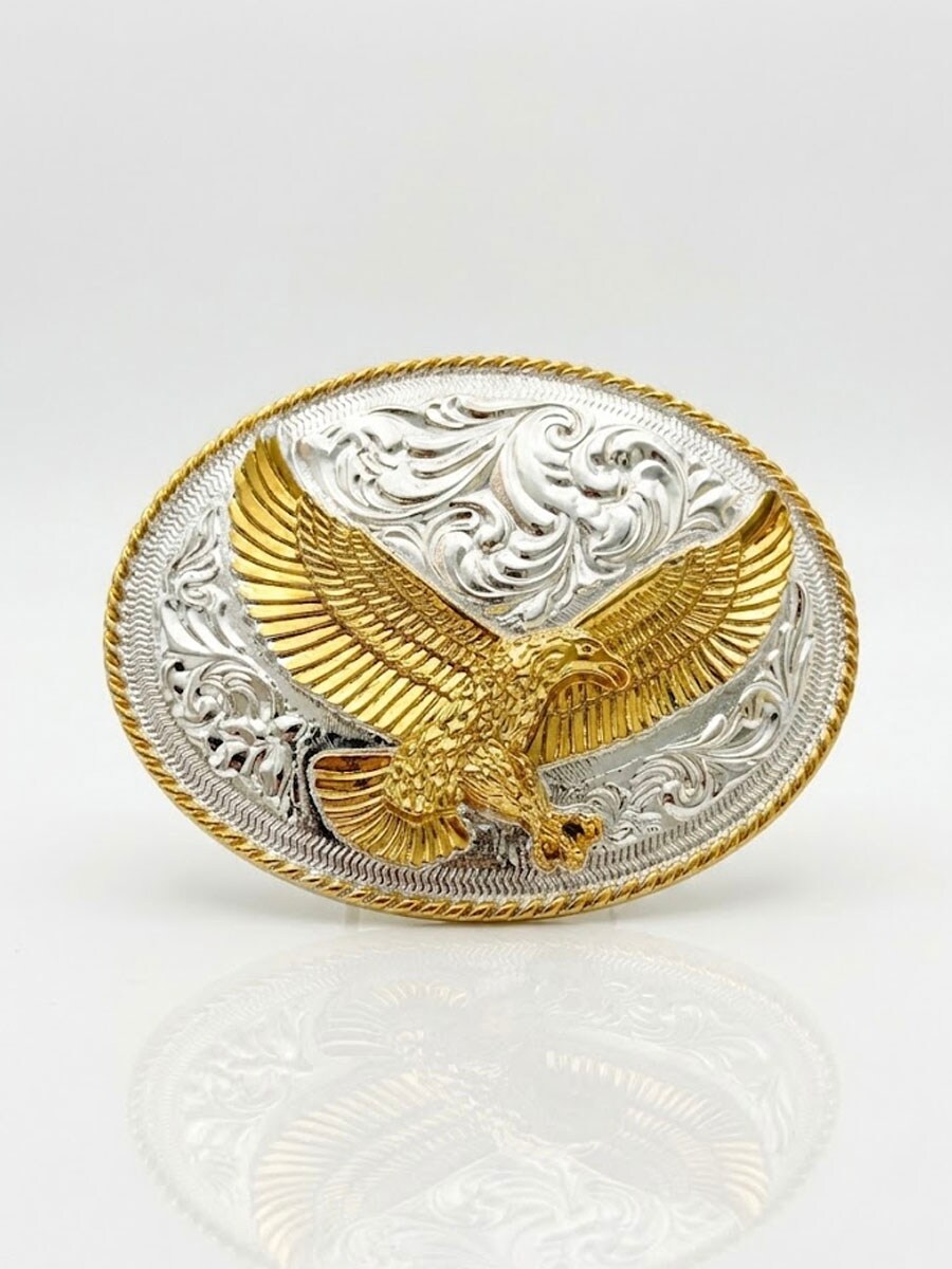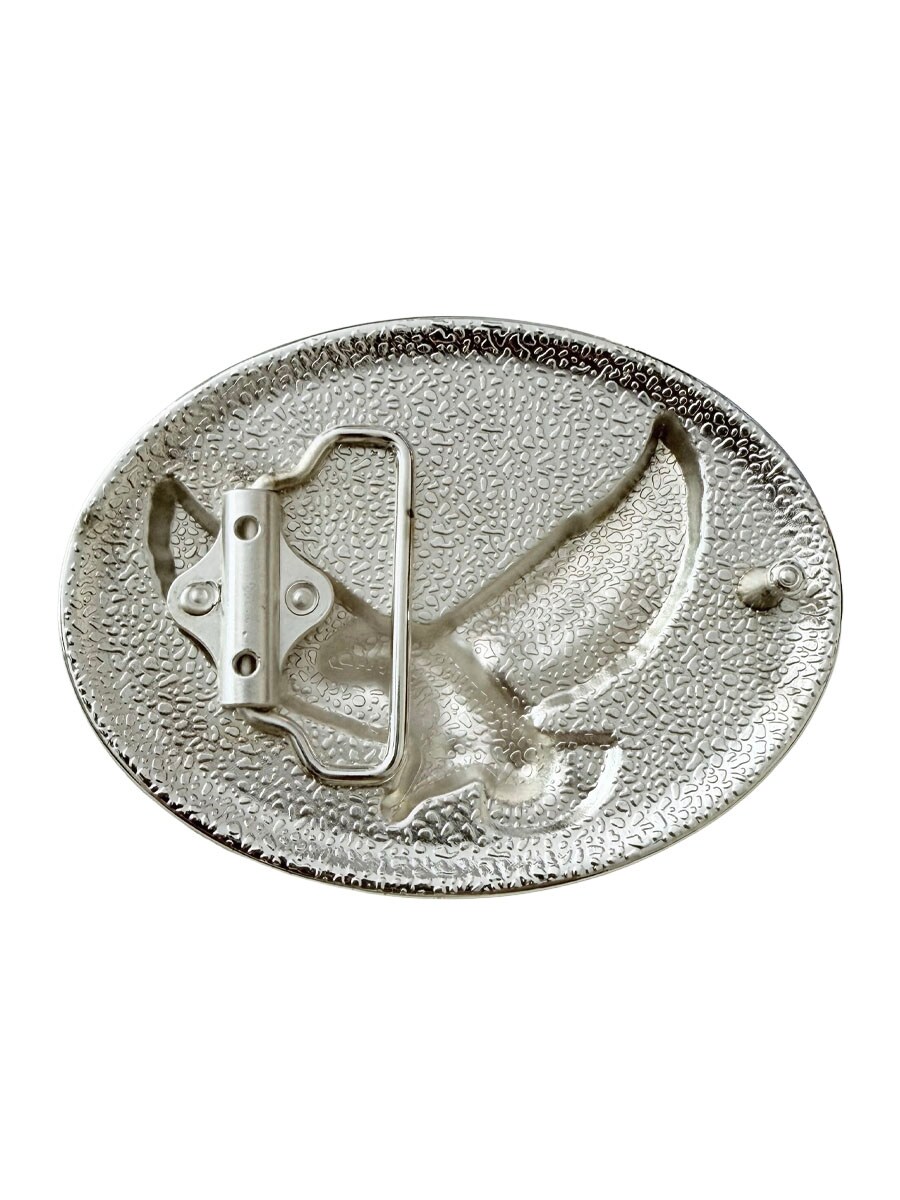 Et elegant beltespenne med ørnemotiv og gravert bakgrunn. Den ovale formen og den dekorative rammen gir en tydelig westernfølelse som virkelig skiller seg ut. Spennen passer til belter opptil 4 cm brede, noe som gjør det enkelt å kombinere med de fleste standardbelter med utskiftbare spenner.