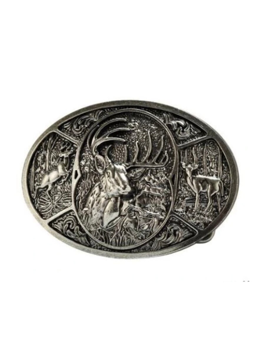 Et ovalt spenne med dyp relieff som viser en majestetisk bukk omgitt av skogsscener. Spennen passer belter opptil 4 cm brede, noe som gjør det enkelt å kombinere med de fleste standardbelter med utskiftbare spenner.