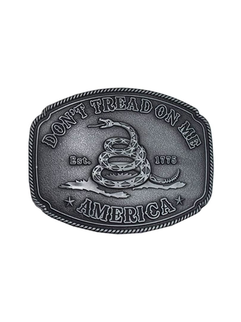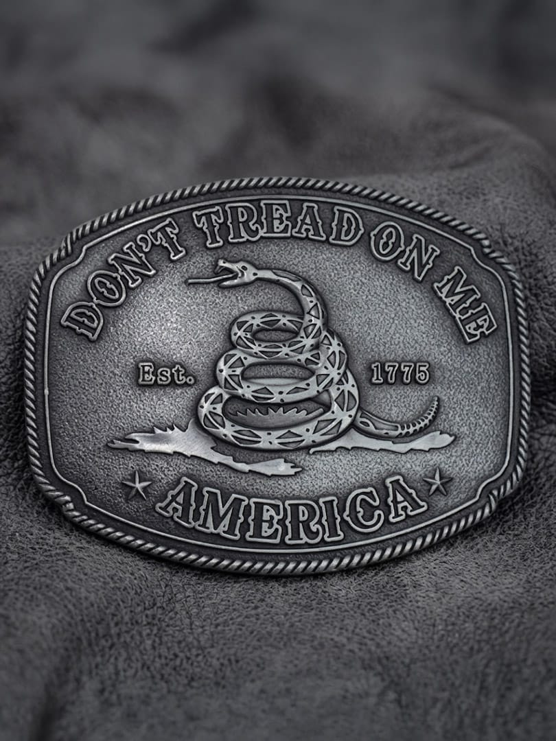 Detaljert beltespenne i mørk finish med en slange og teksten “Don’t Tread on Me”. Designet skaper et kraftfullt og symbolsk uttrykk som formidler selvstendighet og styrke. Spennet passer belter opptil 4 cm brede, noe som gjør det enkelt å kombinere med de fleste standardbelter med utskiftbare spenner.