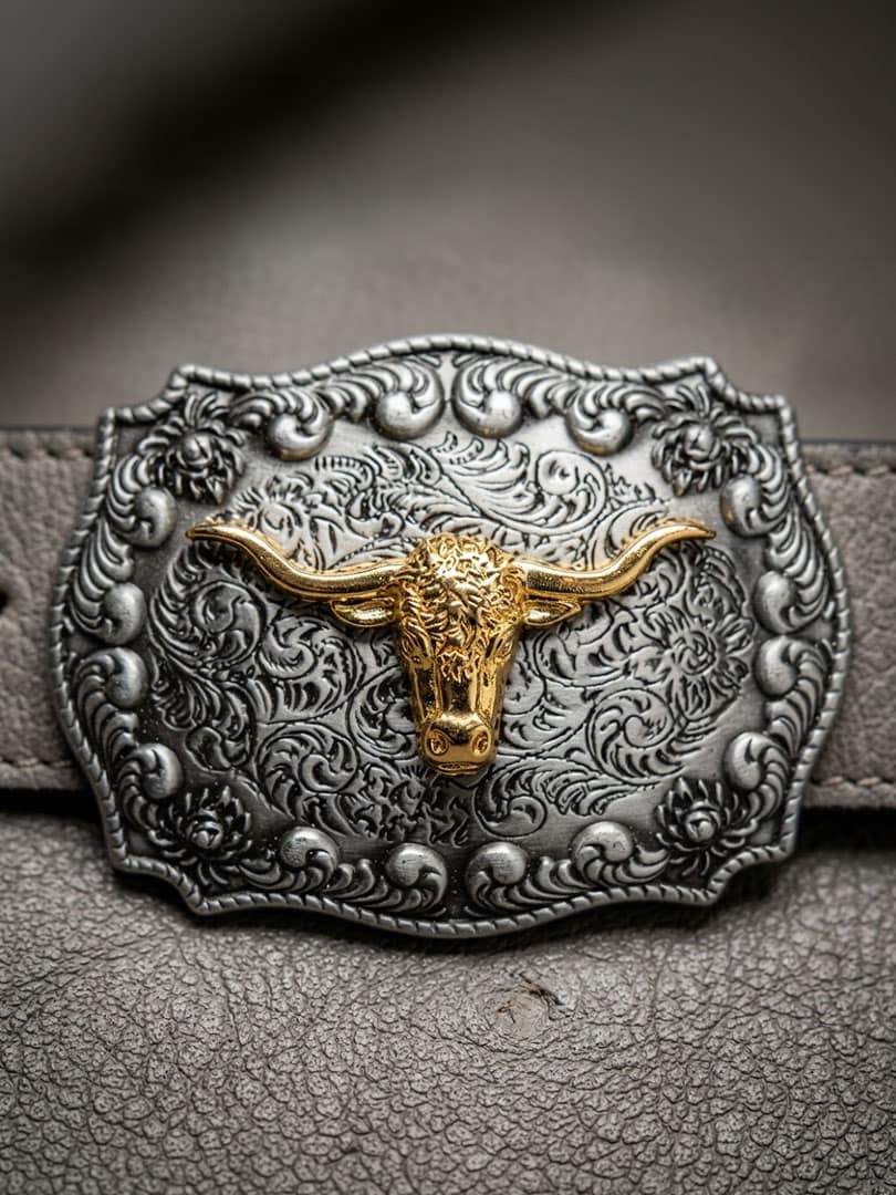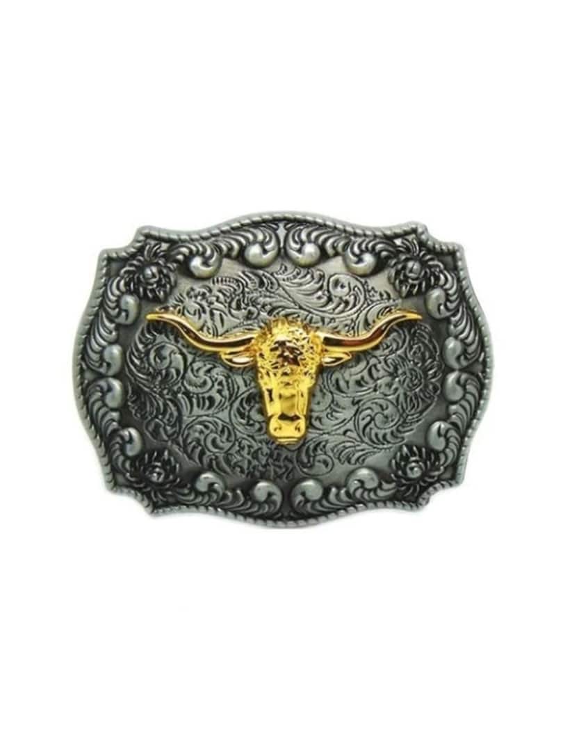 Detaljert beltespenne i antikk finish med en forhøyet, gullbelagt longhorn-applikasjon som gir et sterkt og eksklusivt uttrykk. Spennet passer belter opptil 4 cm brede, noe som gjør det enkelt å kombinere med de fleste standardbelter med utskiftbare spenner.