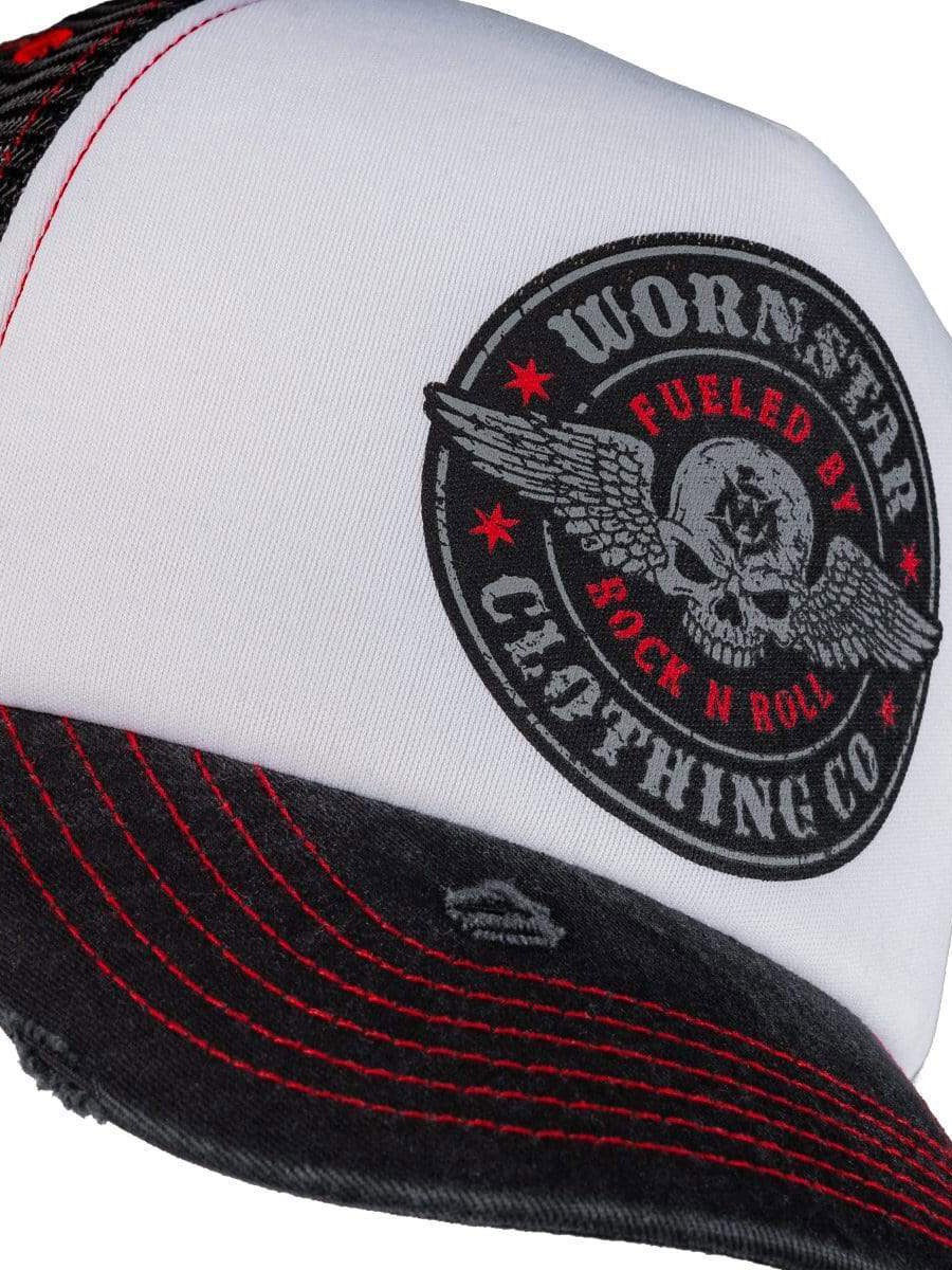 Wornstar Fueled Trucker Caps i svart og hvitt med slitte detaljer er det ultimate valget for en rocka look.
