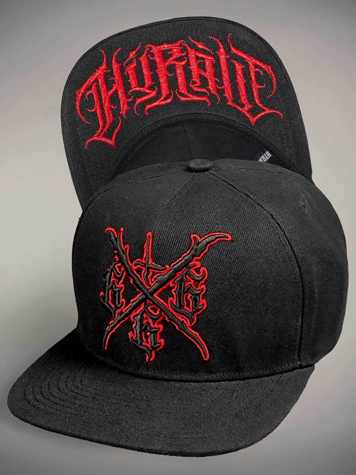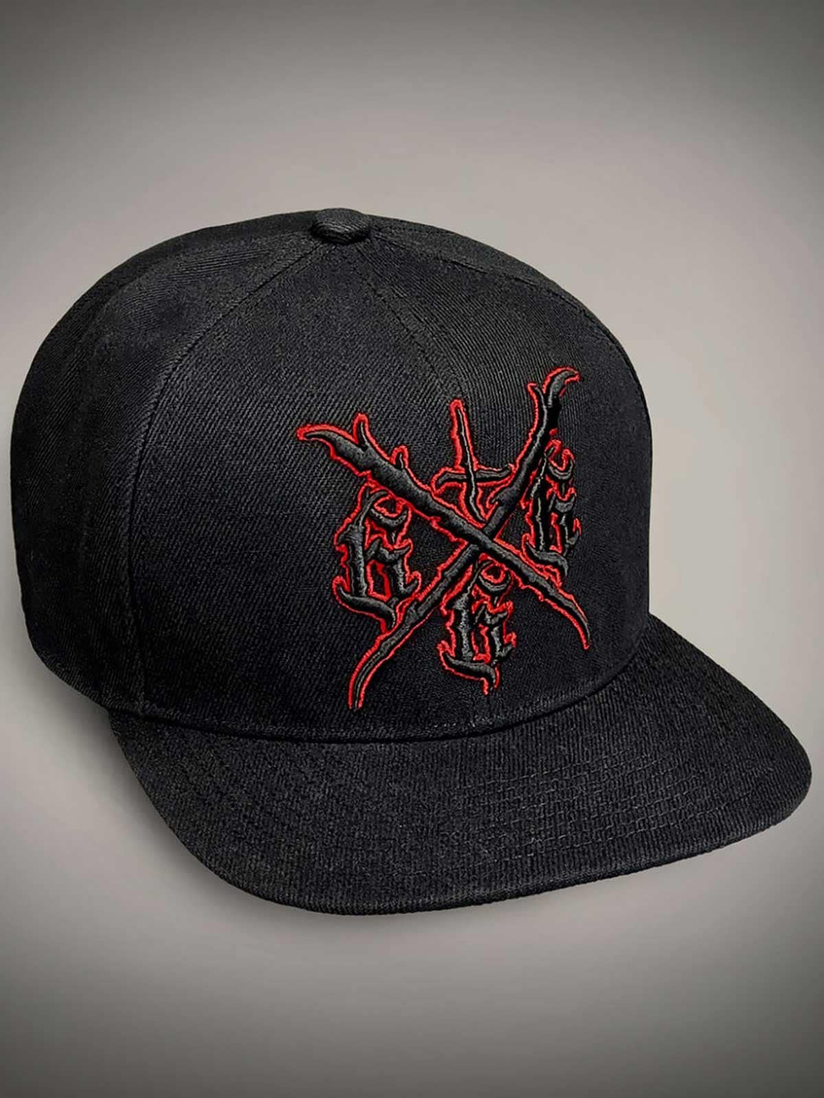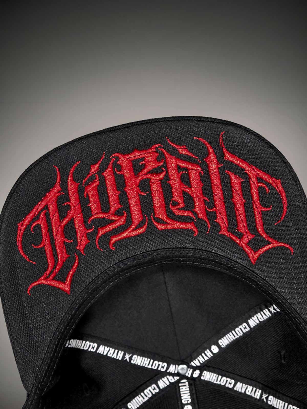 Svart caps med tøft, skreddersydd rødt trykk på undersiden av skjermen, brodert motiv foran og et lite rødt broderi bak. Capsen har flat skjerm og justerbar snapback for en komfortabel passform.
