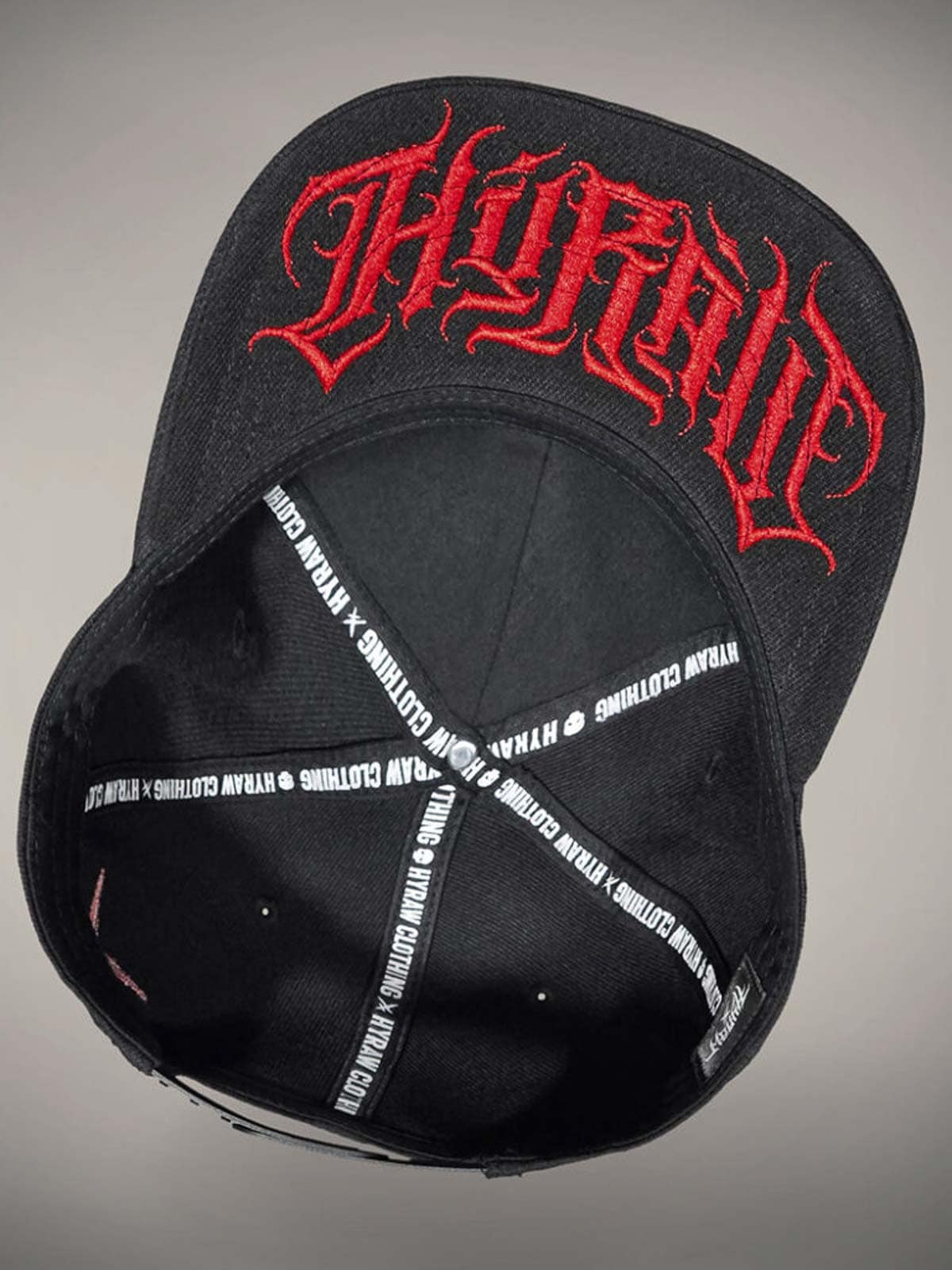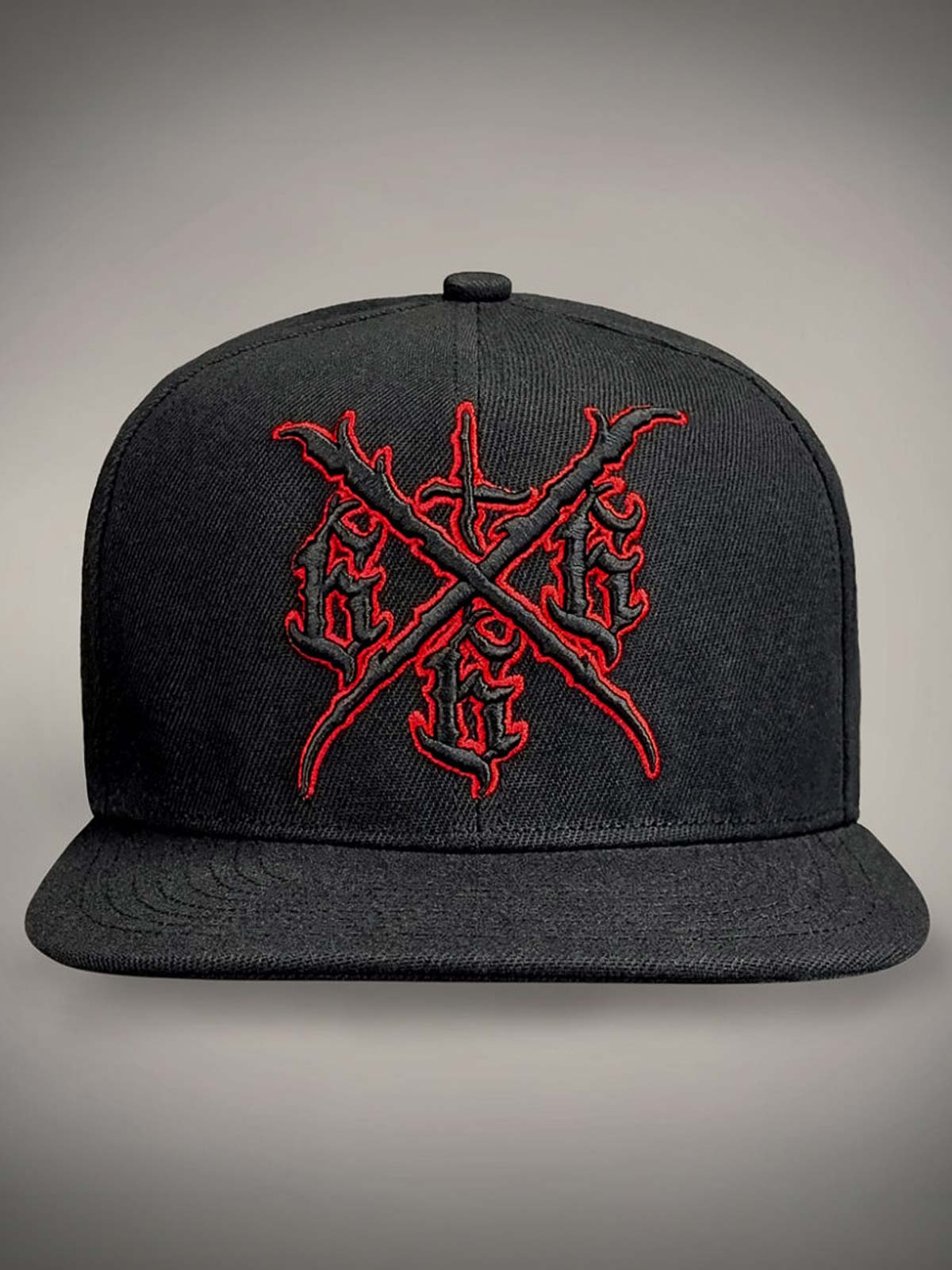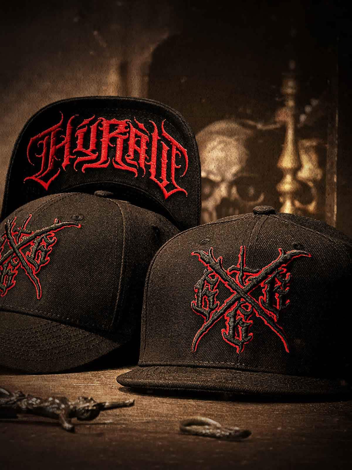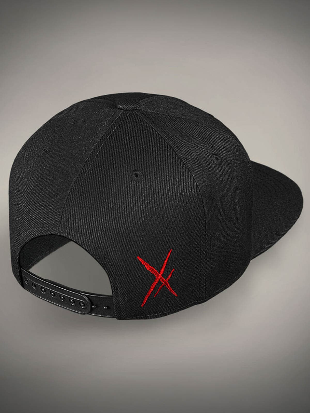 Svart caps med tøft, skreddersydd rødt trykk på undersiden av skjermen, brodert motiv foran og et lite rødt broderi bak. Capsen har flat skjerm og justerbar snapback for en komfortabel passform.