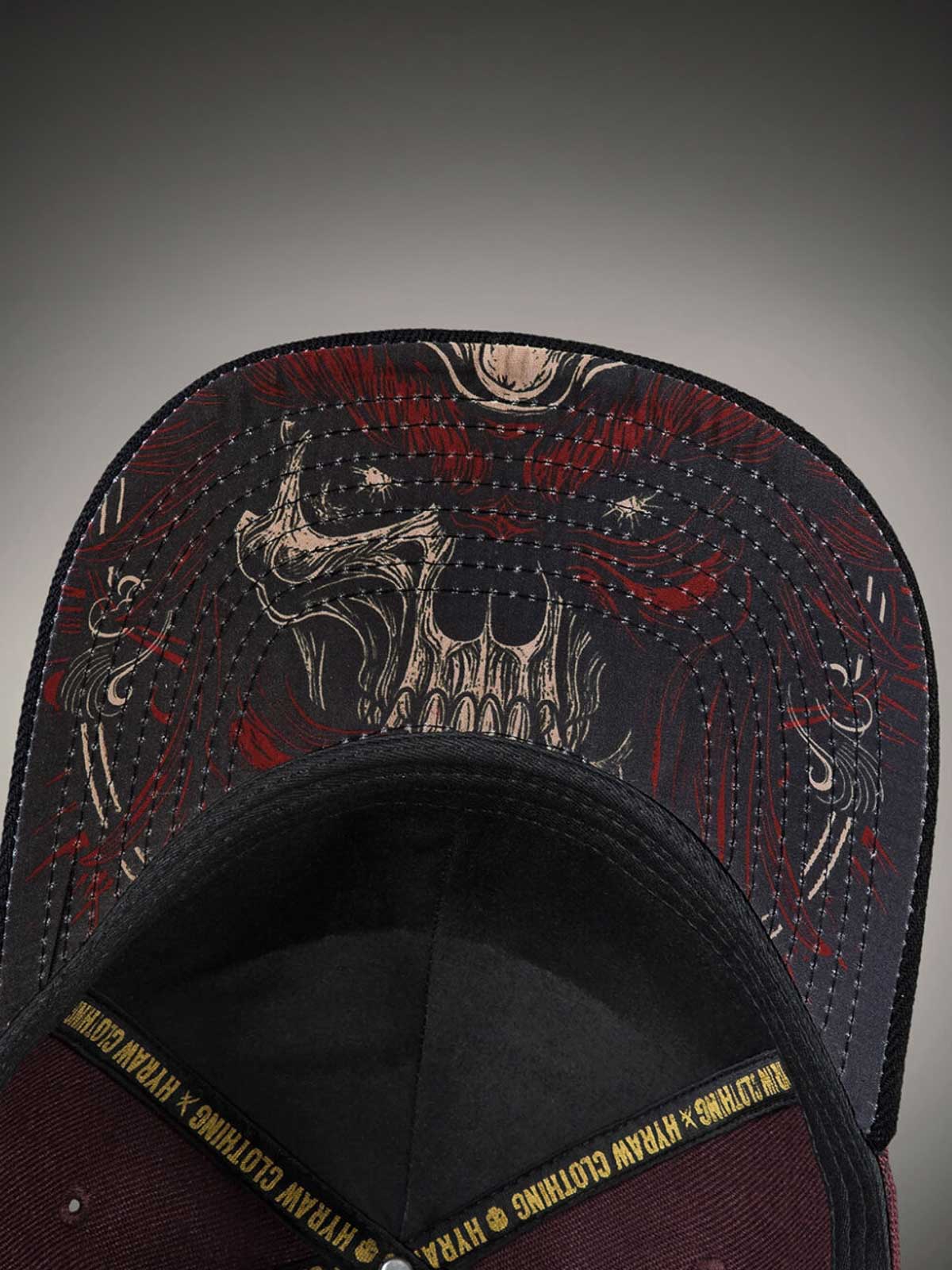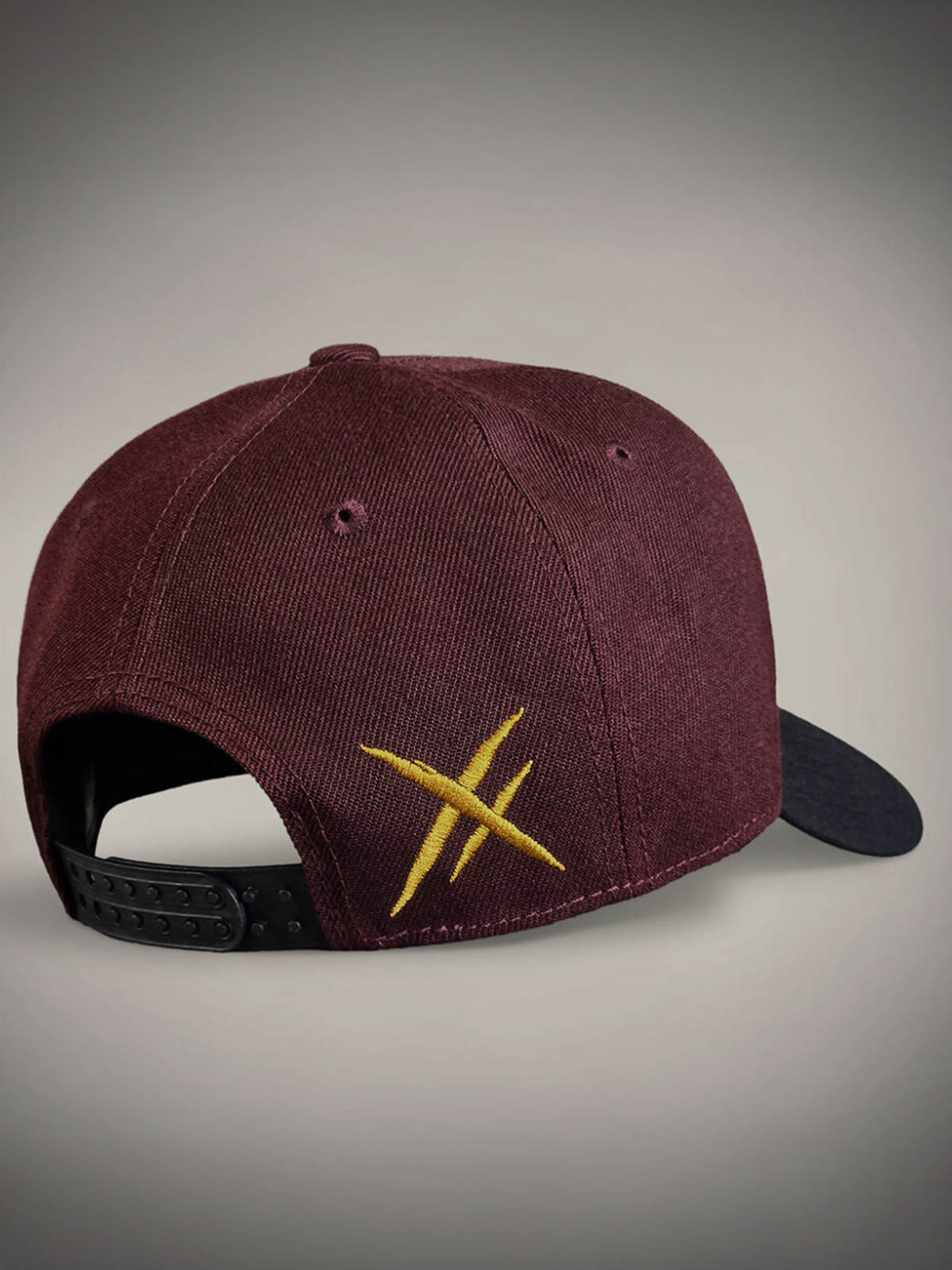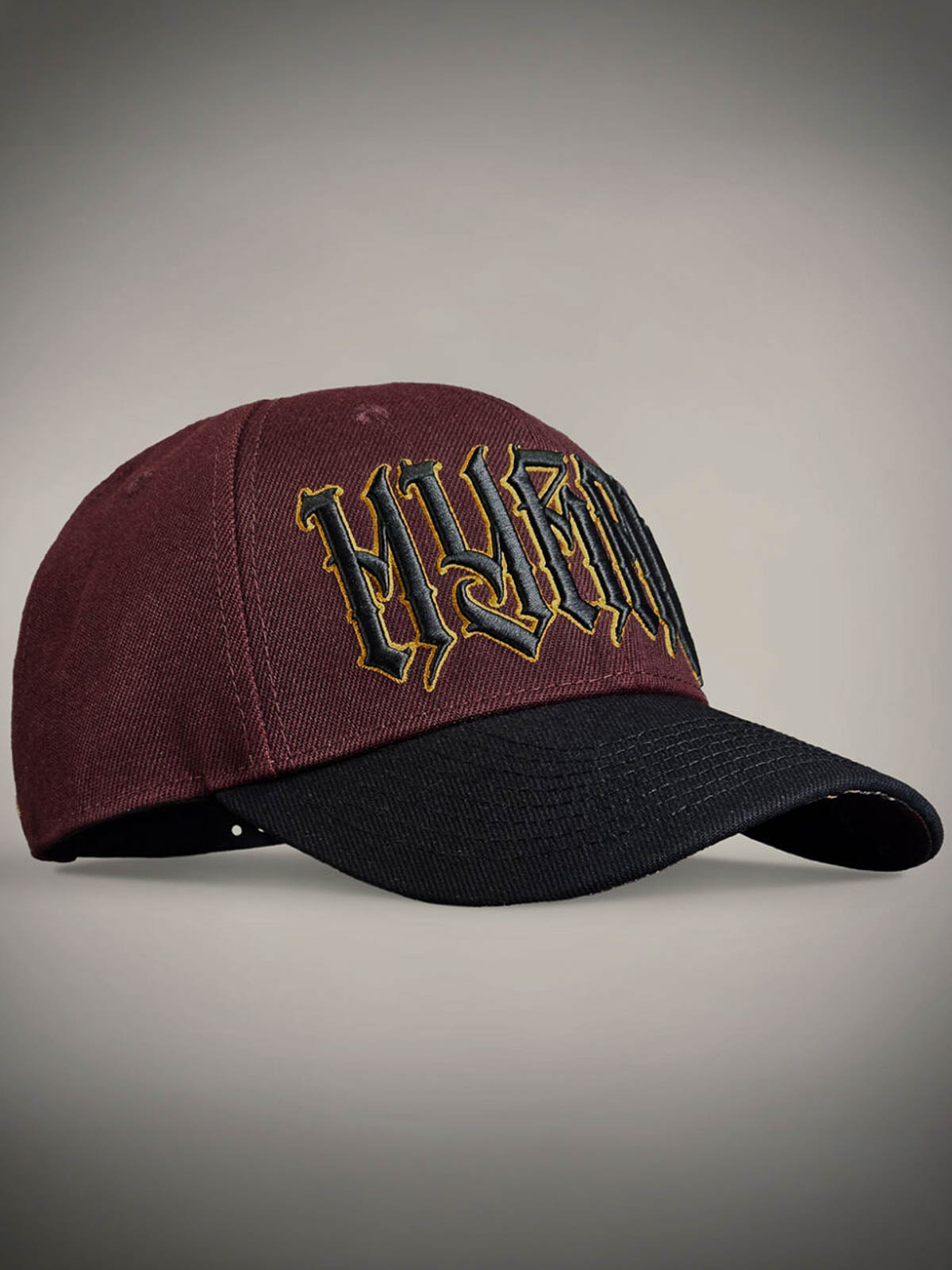 Vinrød caps med buet skjerm, dekorert med skreddersydd logo i svart og gult foran og et brodert gult motiv bak. Undersiden av skjermen er designet med et unikt motiv som gir capsen en ekstra iøynefallende detalj.