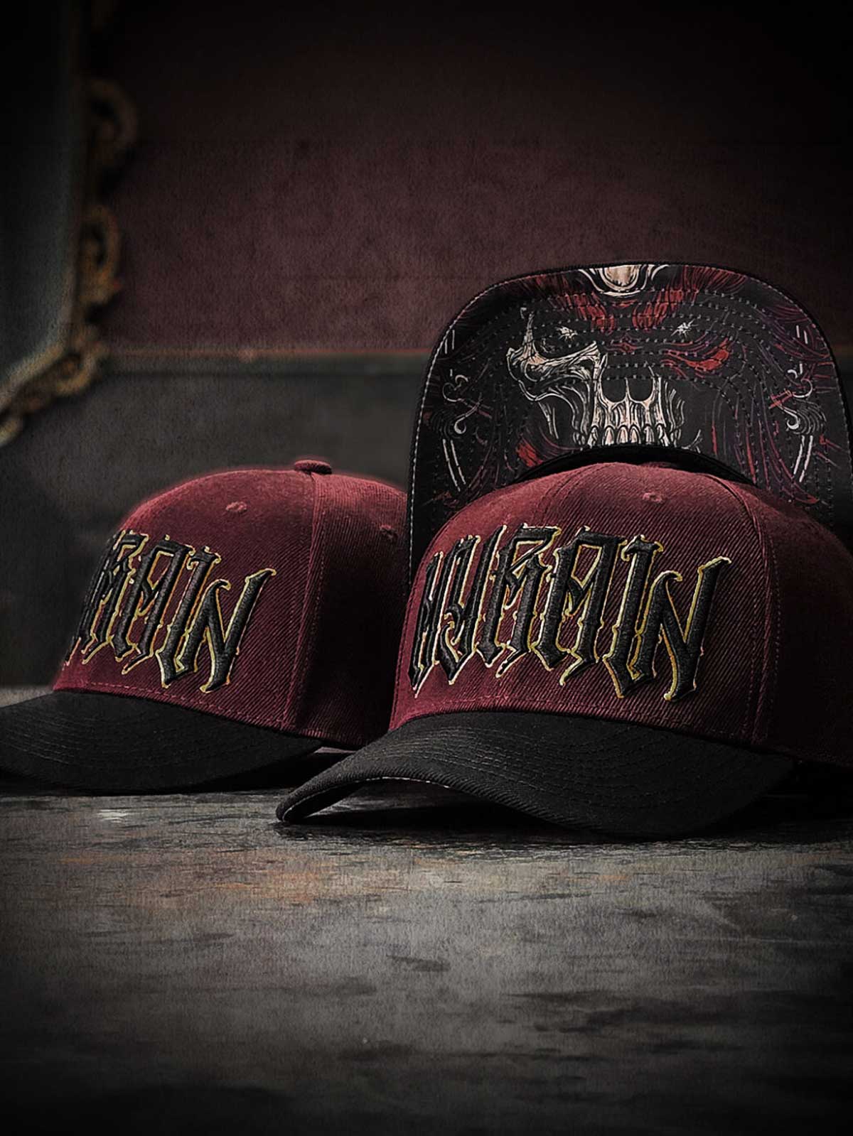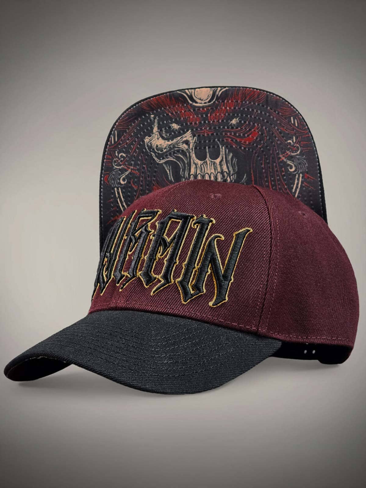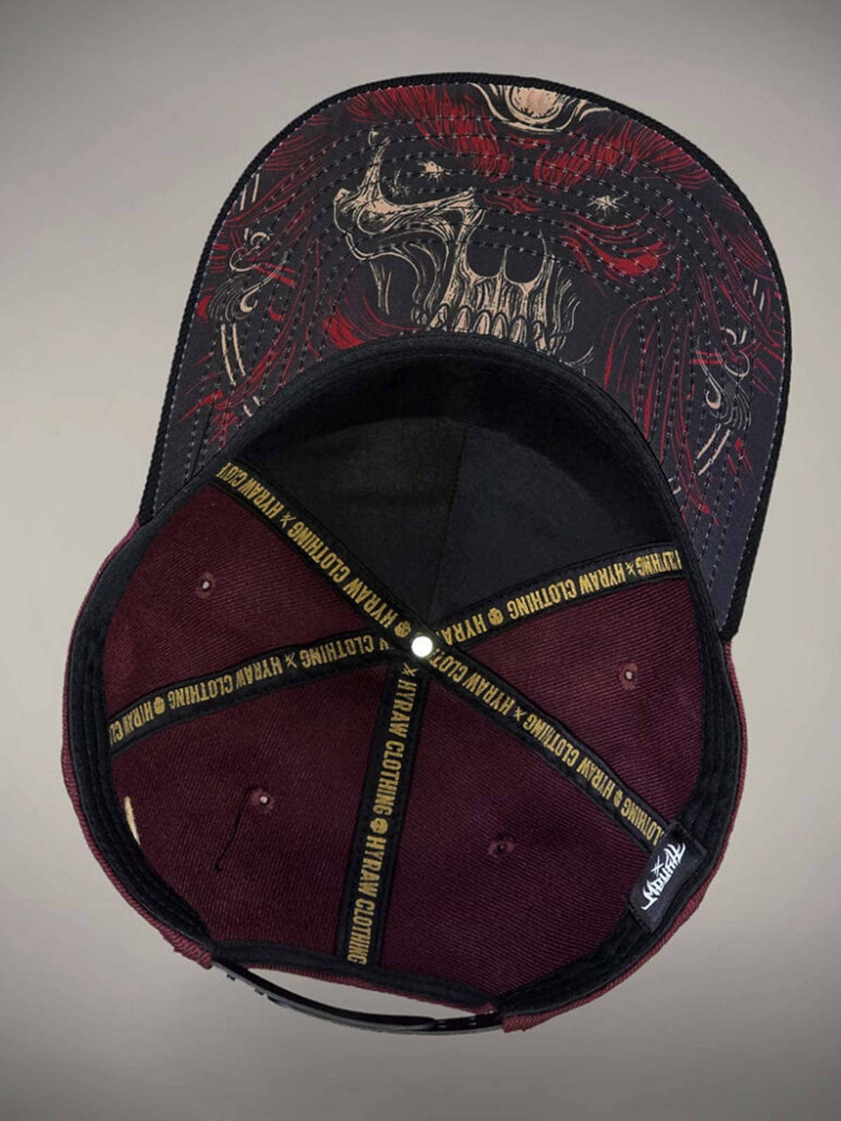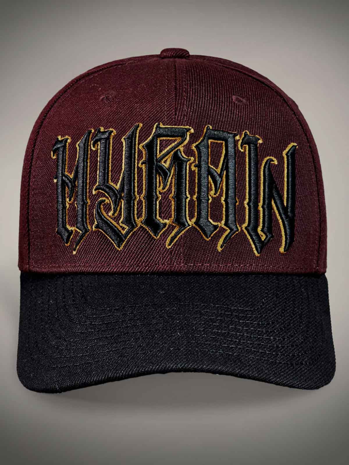Vinrød caps med buet skjerm, dekorert med skreddersydd logo i svart og gult foran og et brodert gult motiv bak. Undersiden av skjermen er designet med et unikt motiv som gir capsen en ekstra iøynefallende detalj.