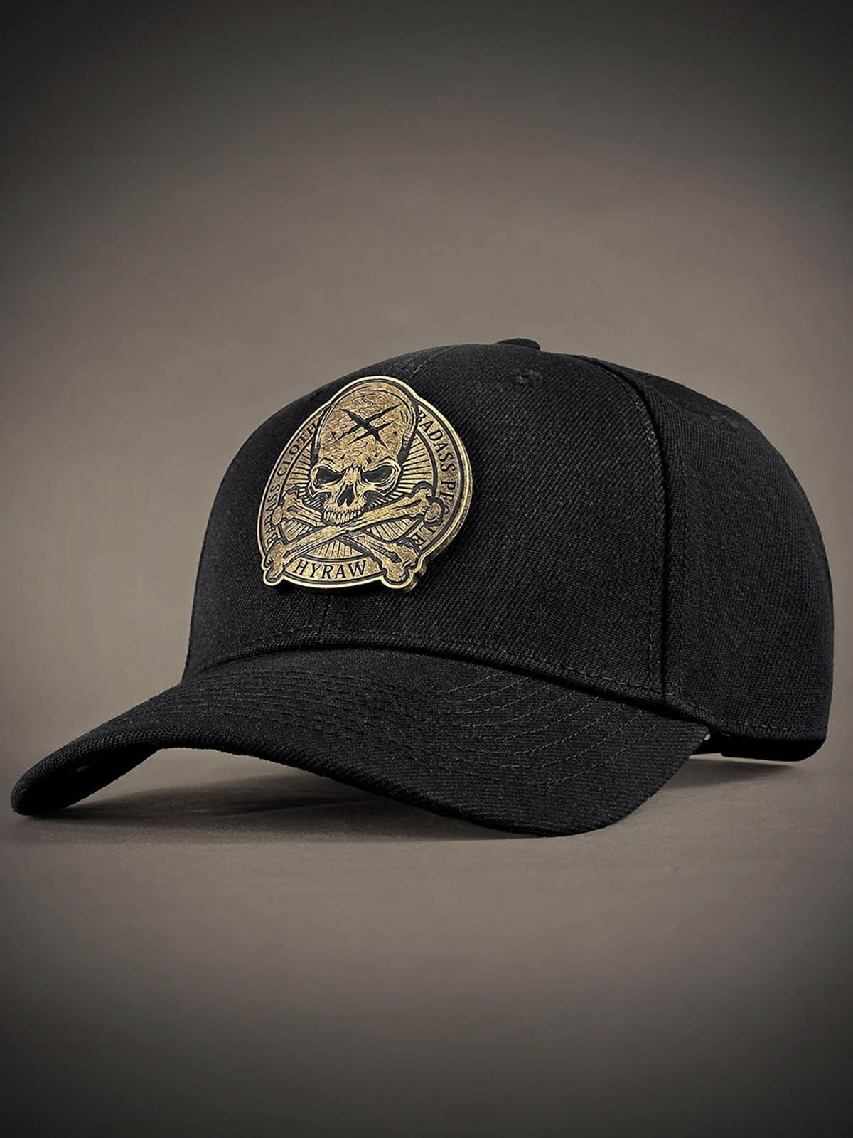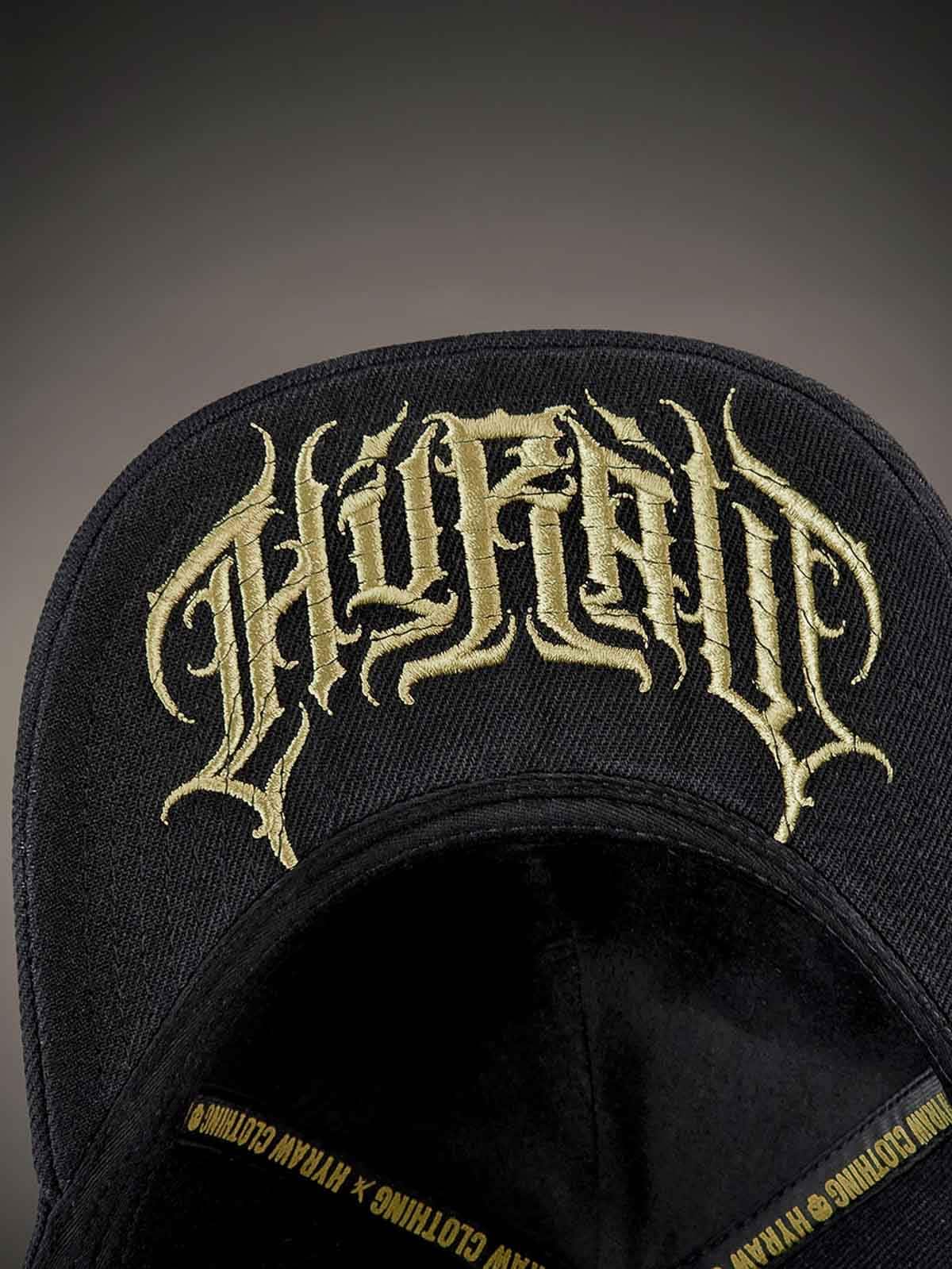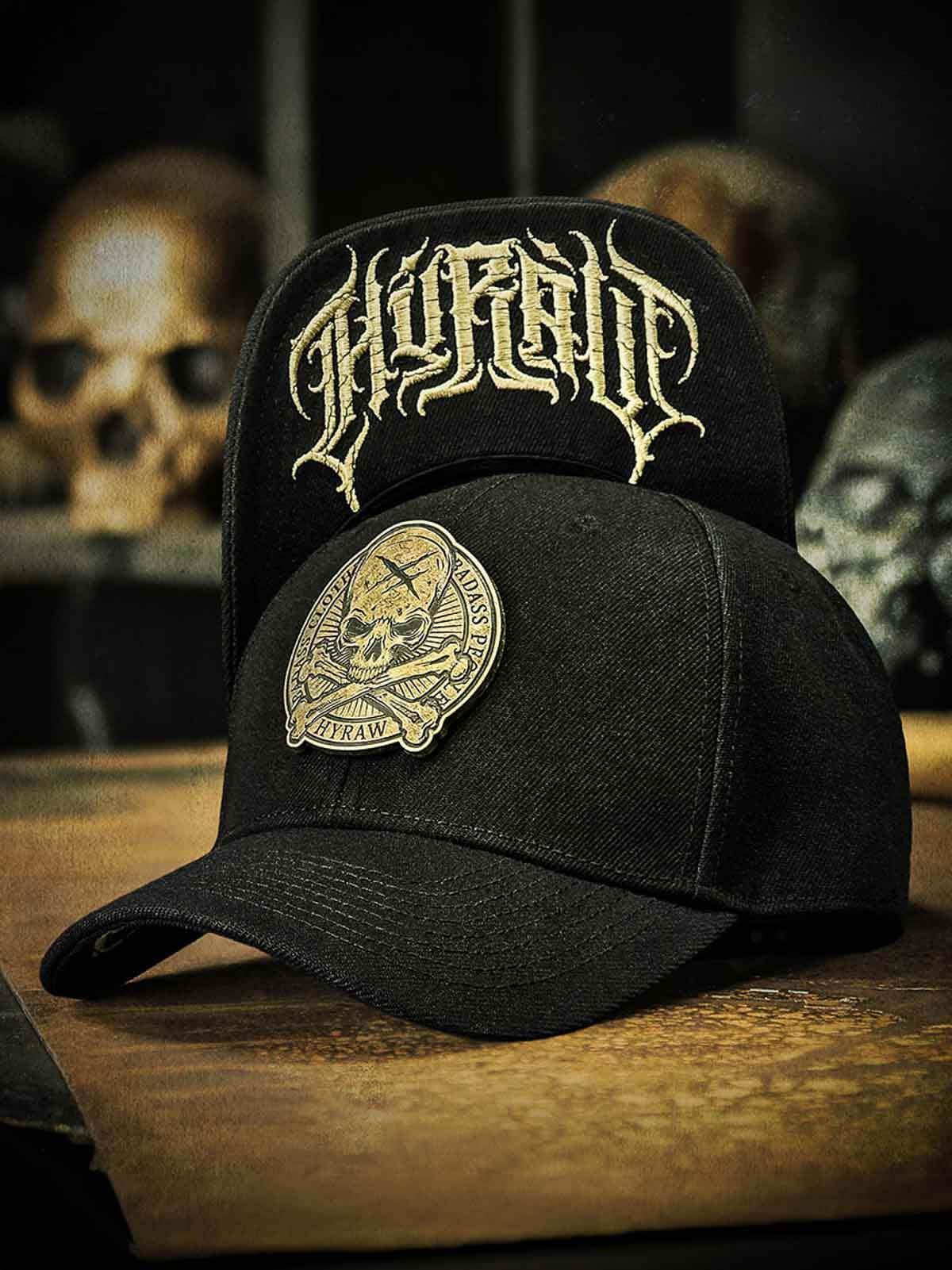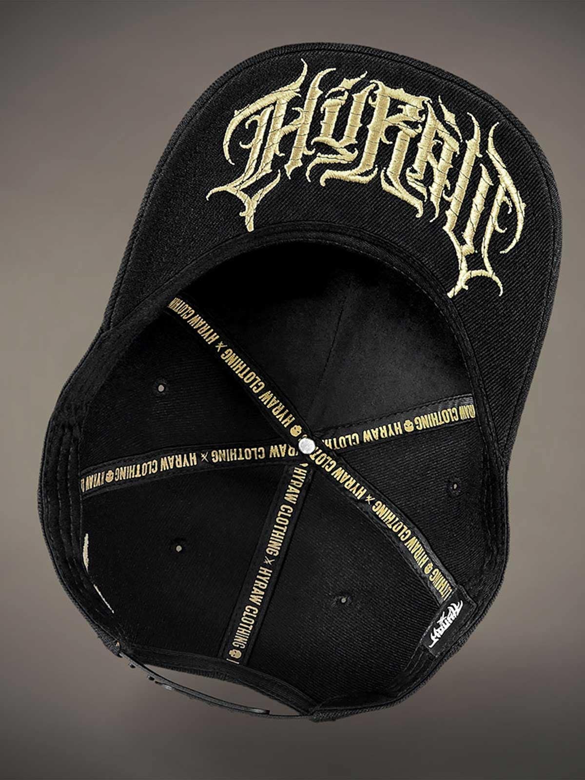 Svart caps med snapback og buet skjerm. Dekorert med en metallpatch på forsiden med dødningehodemotiv. Undersiden av skjermen er designet med en brodert logo.