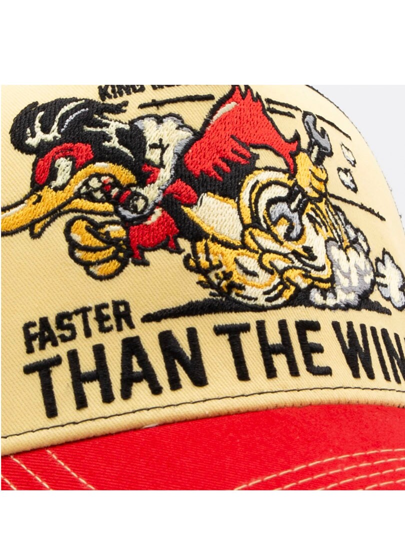 Stilig caps med rød skjerm som gir et tydelig fargeutsagn. Den beige frontpanelen skaper en retrofølelse, og den svarte mesh-baksiden tilfører den perfekte dosen kulhet. Fronten er designet med brodert trykk foran med teksten «Faster Than The Wind». Takket være det luftige mesh-materialet og den justerbare snapback-lukningen sitter caps alltid komfortabelt.