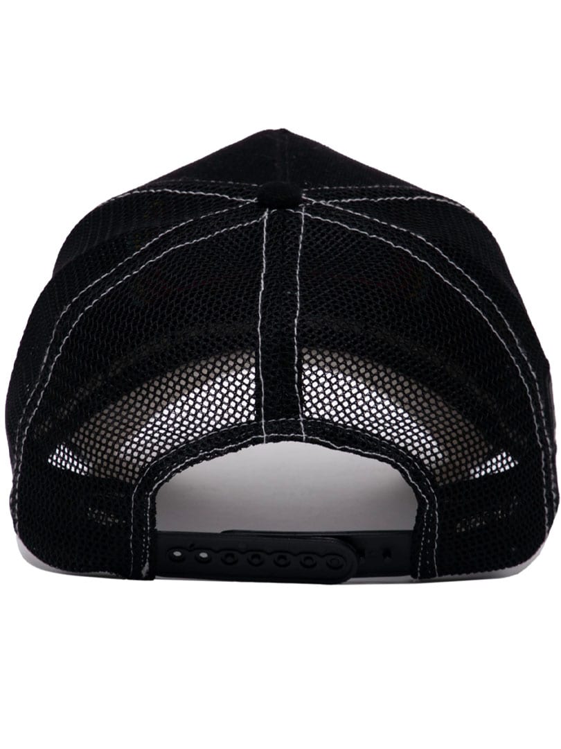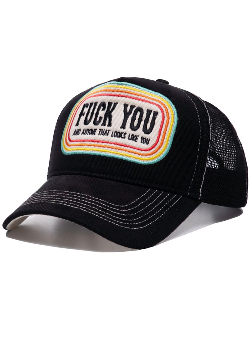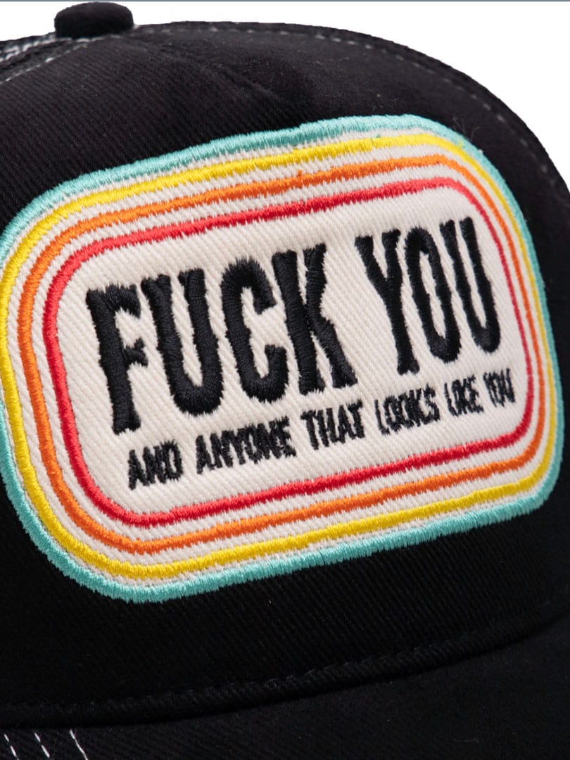 Svart caps med et tøft, spesialtilpasset «fuck you»-trykk foran. Den har kontrastfargede sømmer, mesh bak og buet brem.