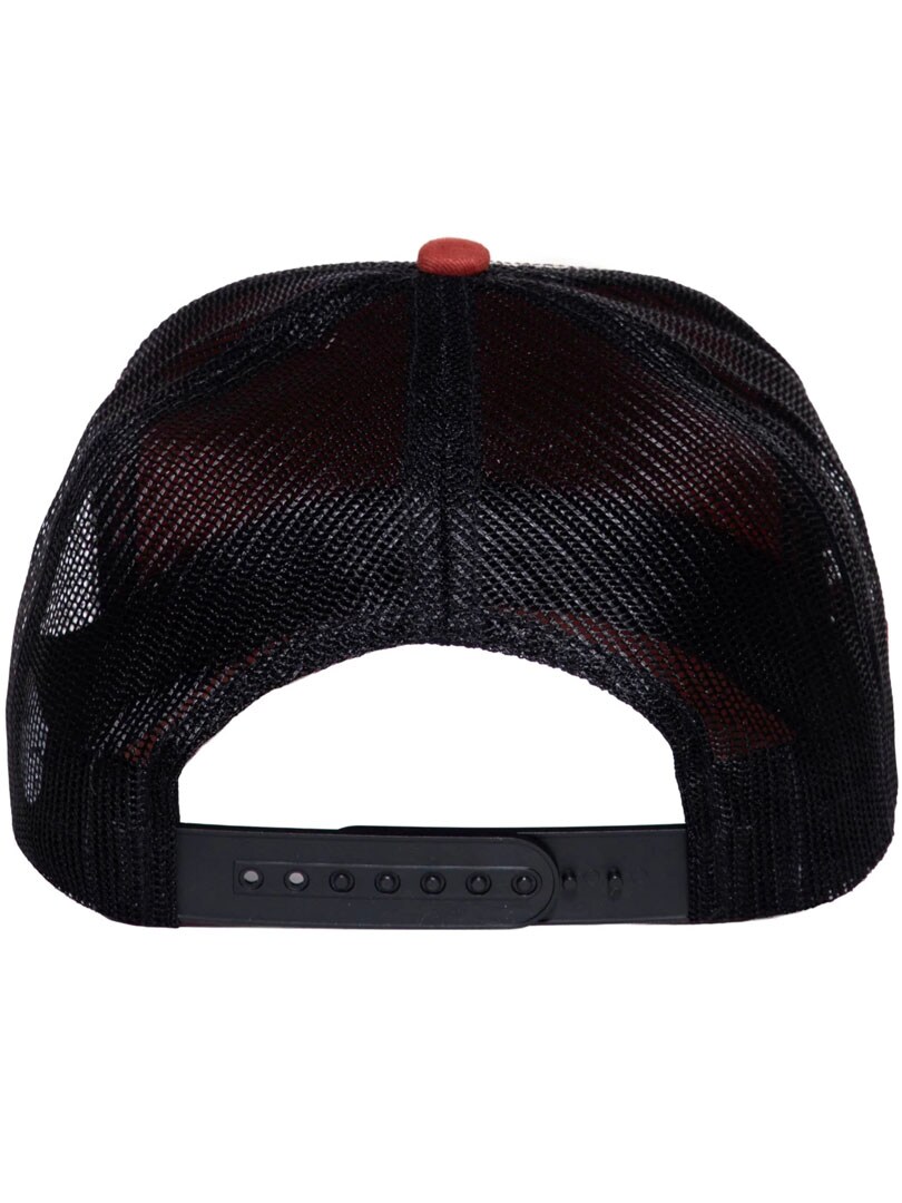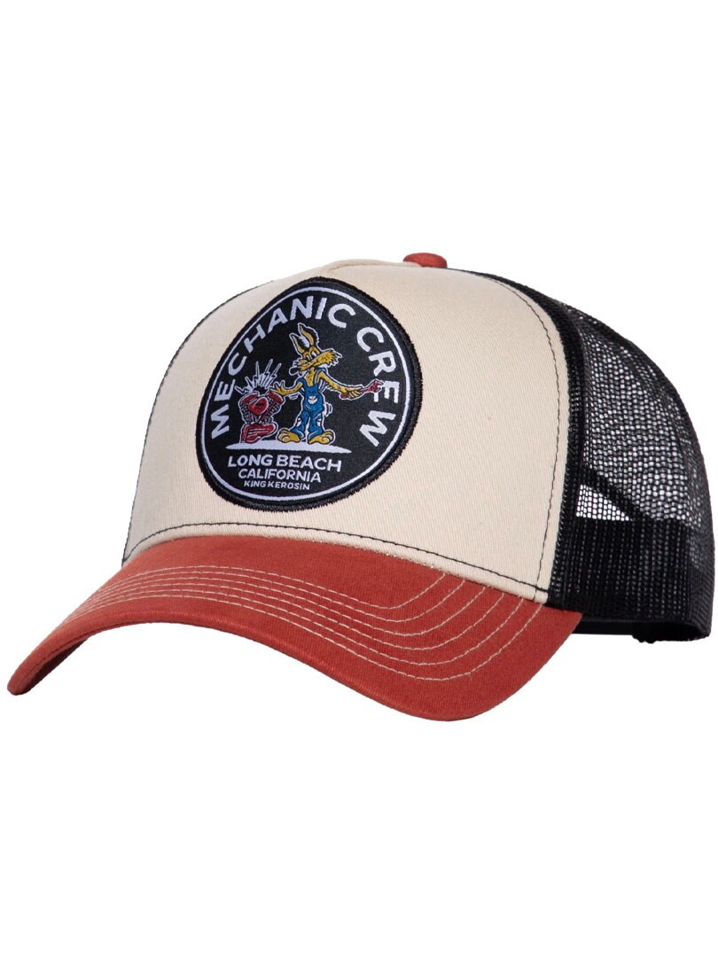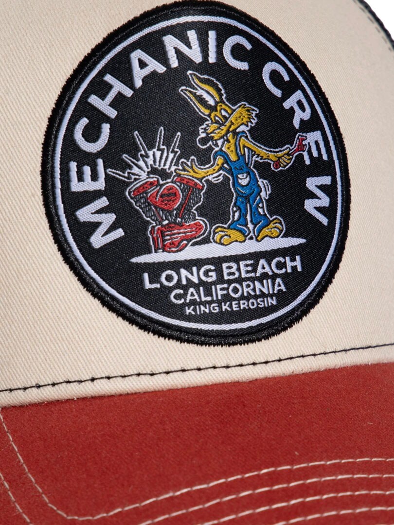 Stilig caps med rød brem og svart mesh bak. På fronten sitter en stor og detaljrik patch som viser to ville mekanikerfigurer i action og virkelig fanger oppmerksomheten. Den har snapback-lukking og buet brem.