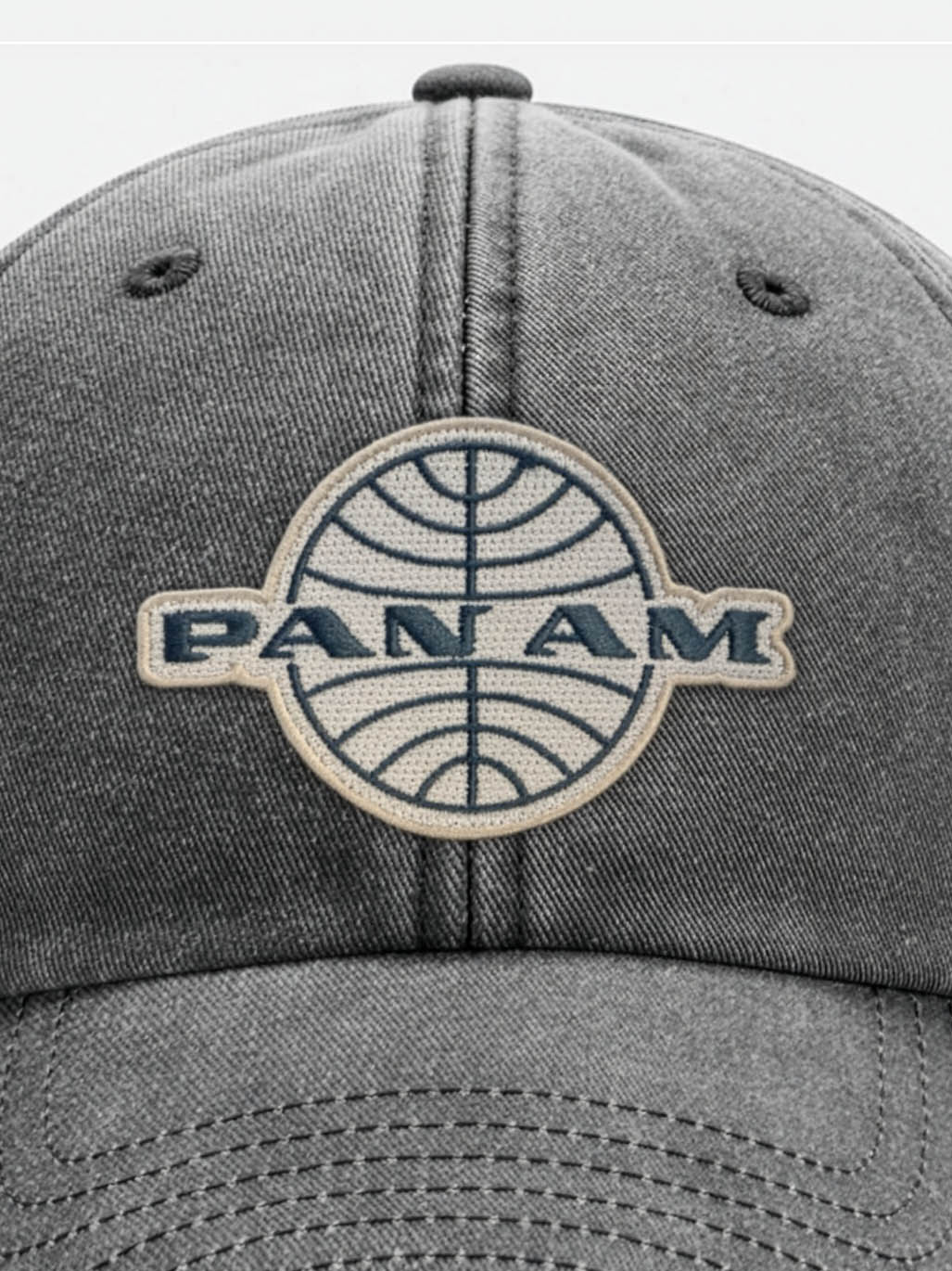 Svart vintage-inspirert keps med buet skjerm og justerbar rem bak, som gjør det enkelt å tilpasse passformen for maksimal komfort. Den har lav profil og en ikonisk logopatch foran som hyller det legendariske amerikanske flyselskapet Pan Am – et merke som forbindes med flyreiser, retrostil og jet-era-estetikk.
