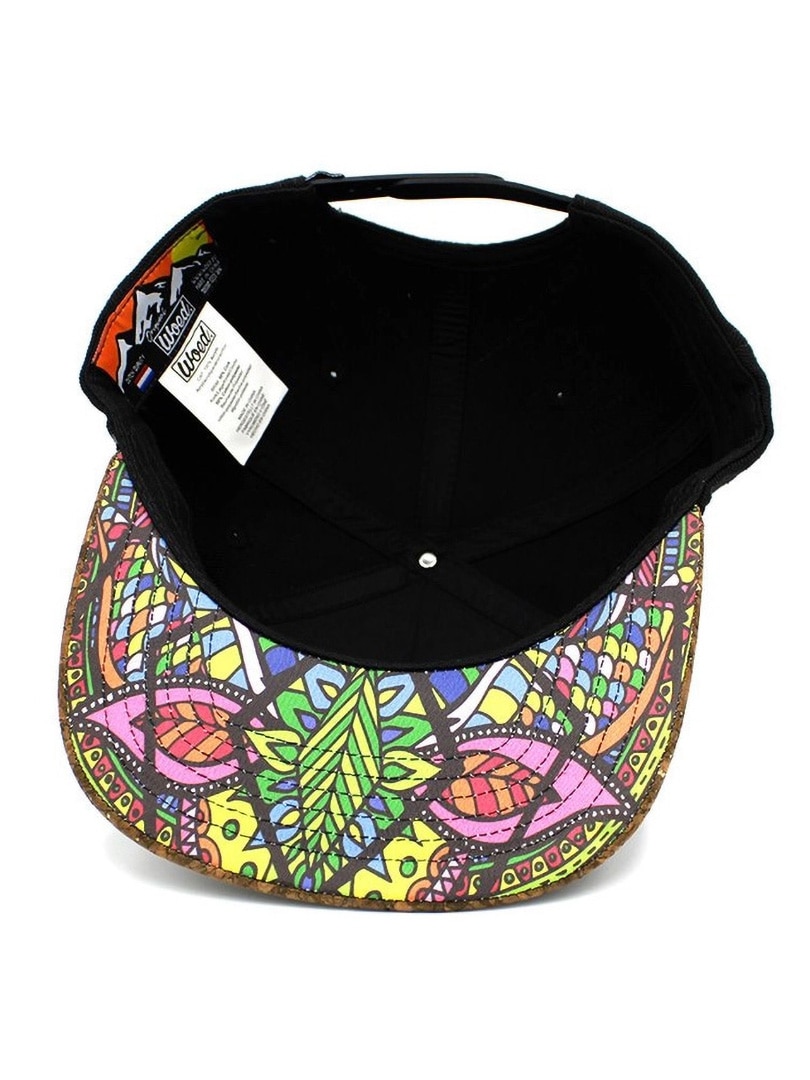 Snapback-caps i slitesterk akryl med 3D-brodert logo foran. Skyggen har en overside i kork og et fargerikt kunstmotiv av Minka Hoek på undersiden, noe som gir capsen et unikt uttrykk.
