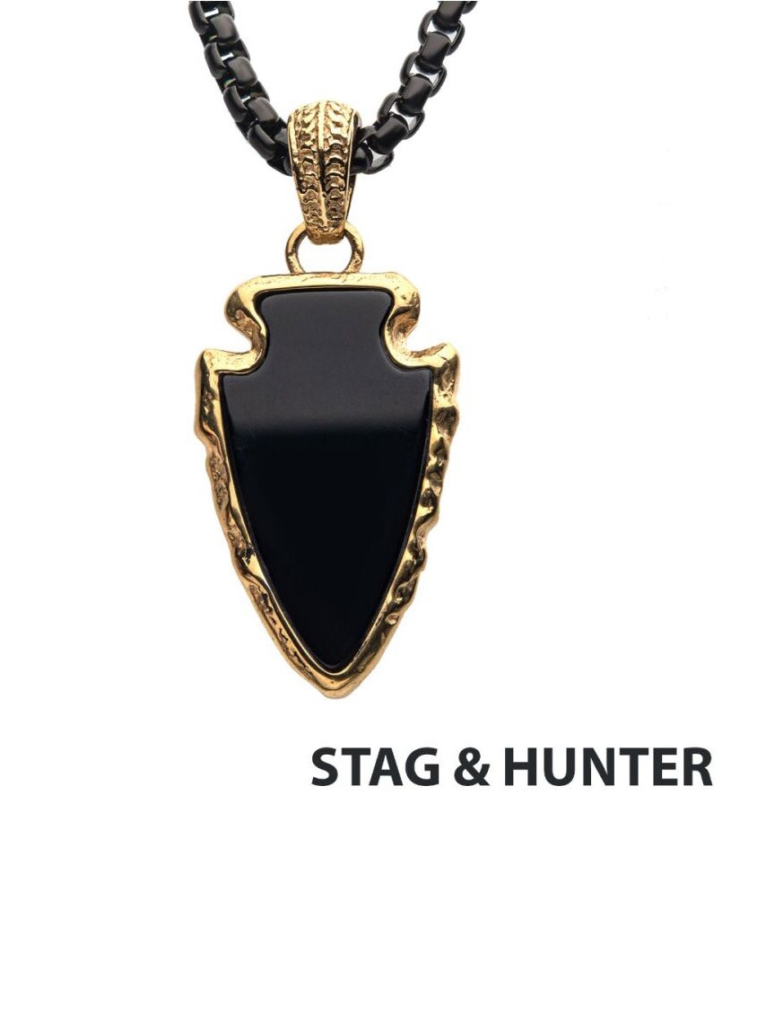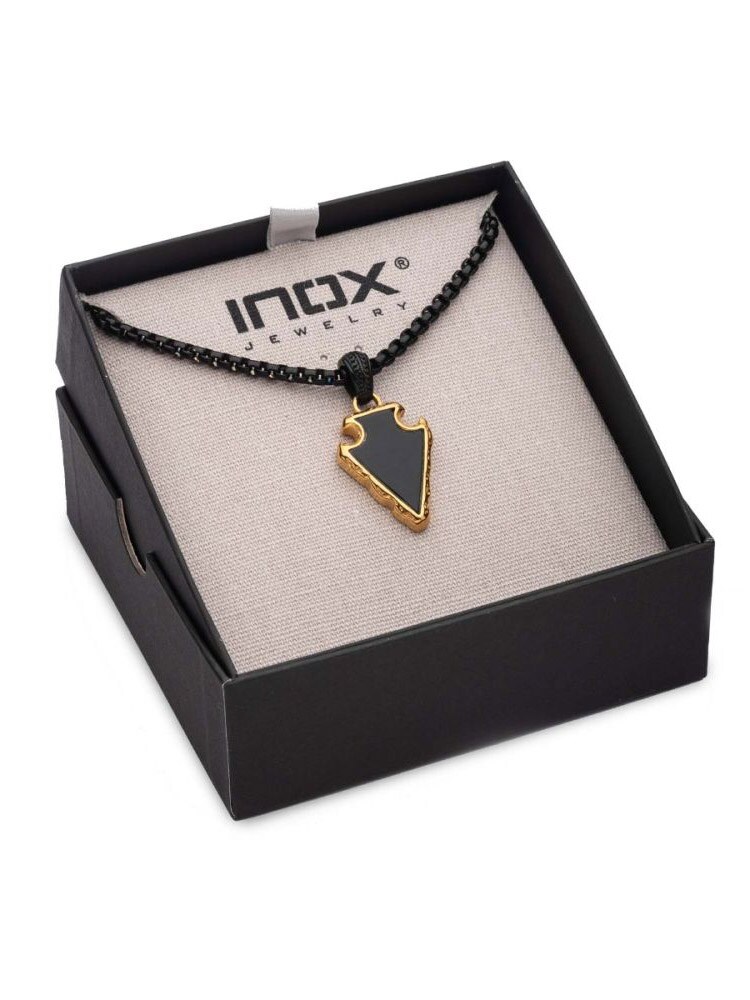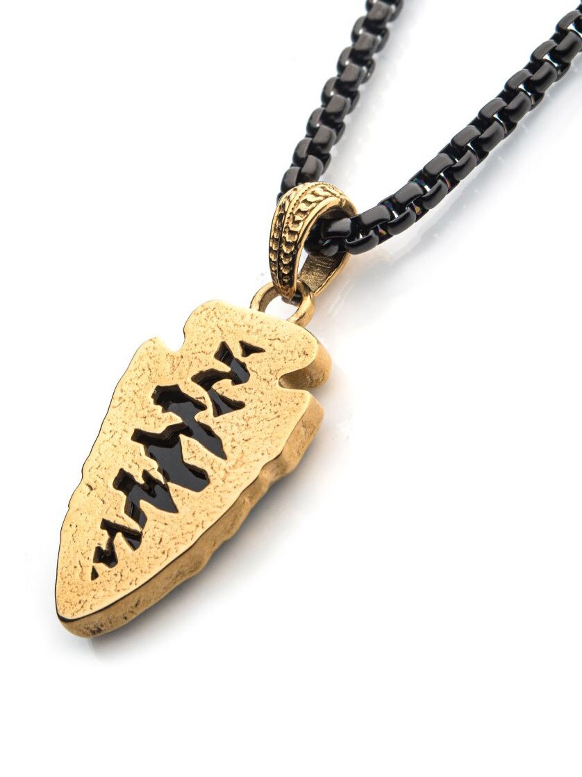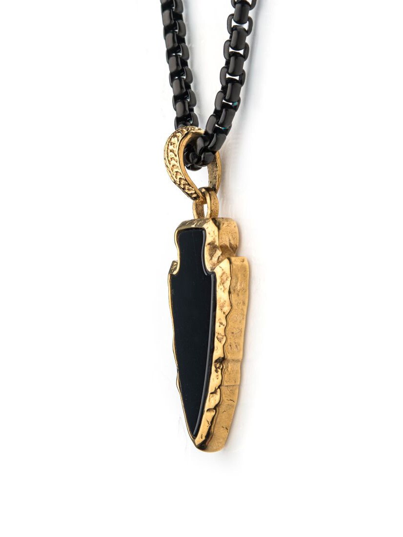 Halskjede med polert bokskjede i svart IP-stål. Anhenget er formet som en pilspiss og består av svart agatstein, innrammet i en solid gullbelagt ramme.