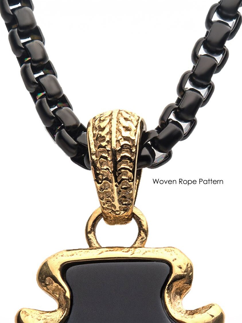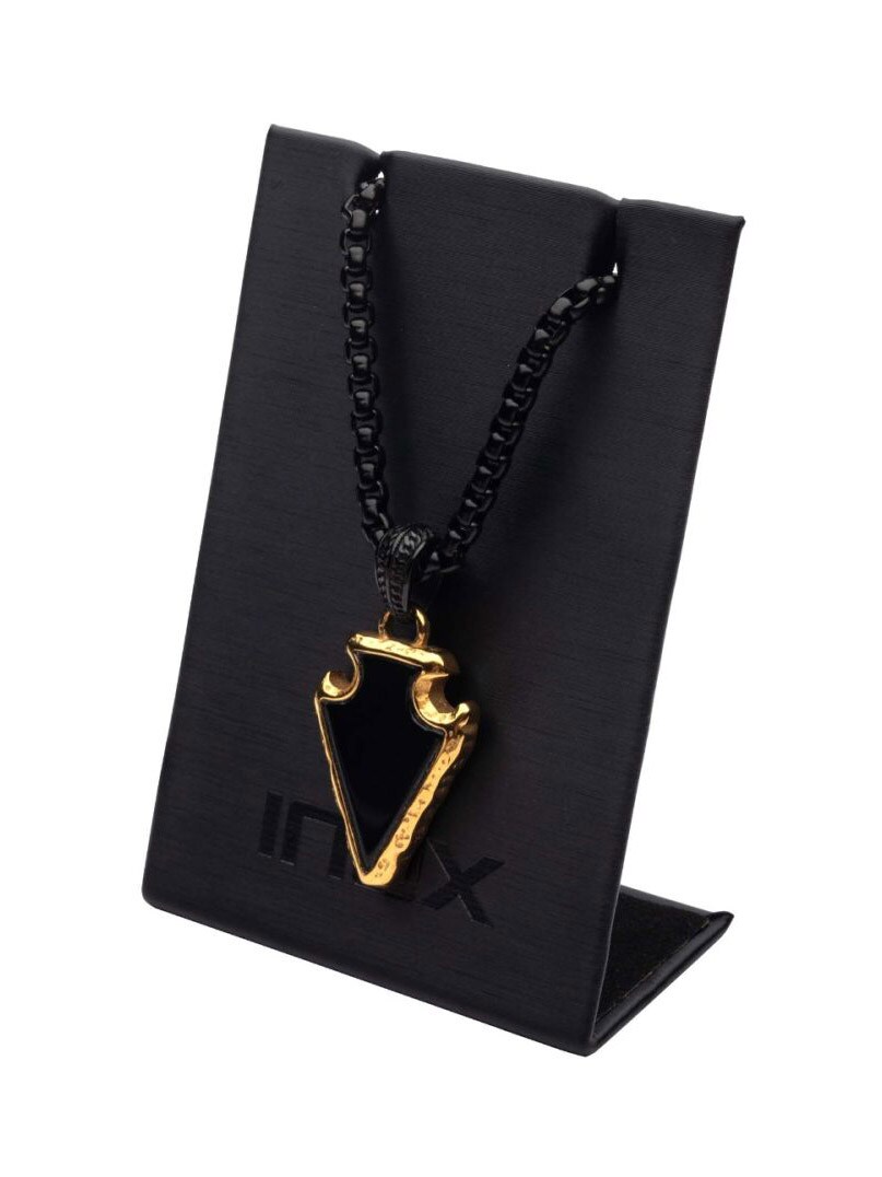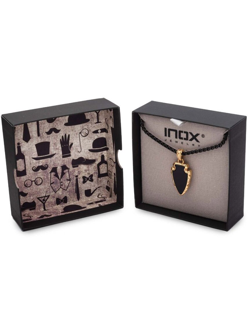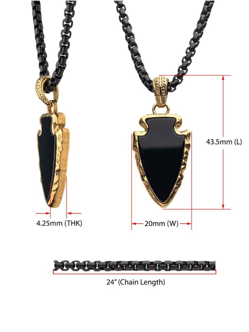 Halskjede med polert bokskjede i svart IP-stål. Anhenget er formet som en pilspiss og består av svart agatstein, innrammet i en solid gullbelagt ramme.