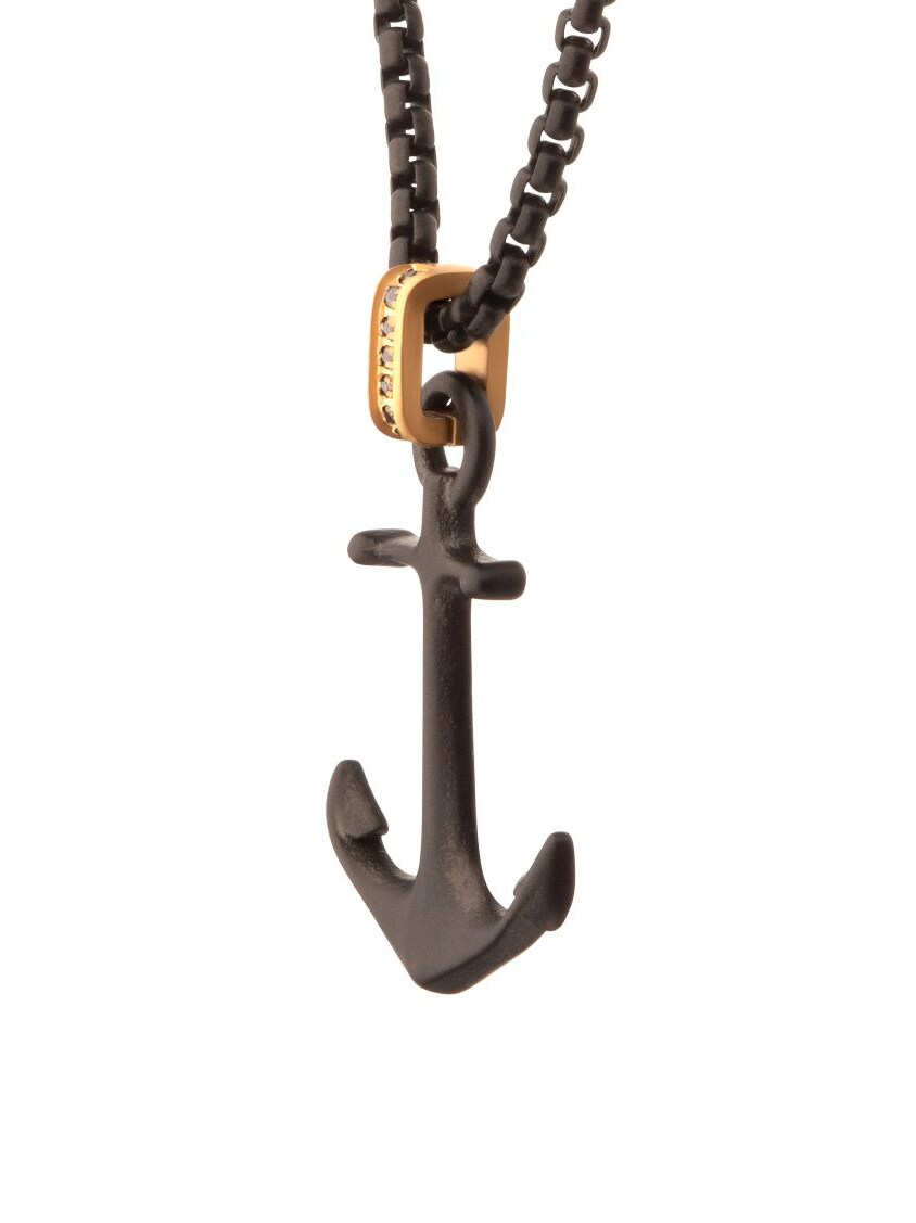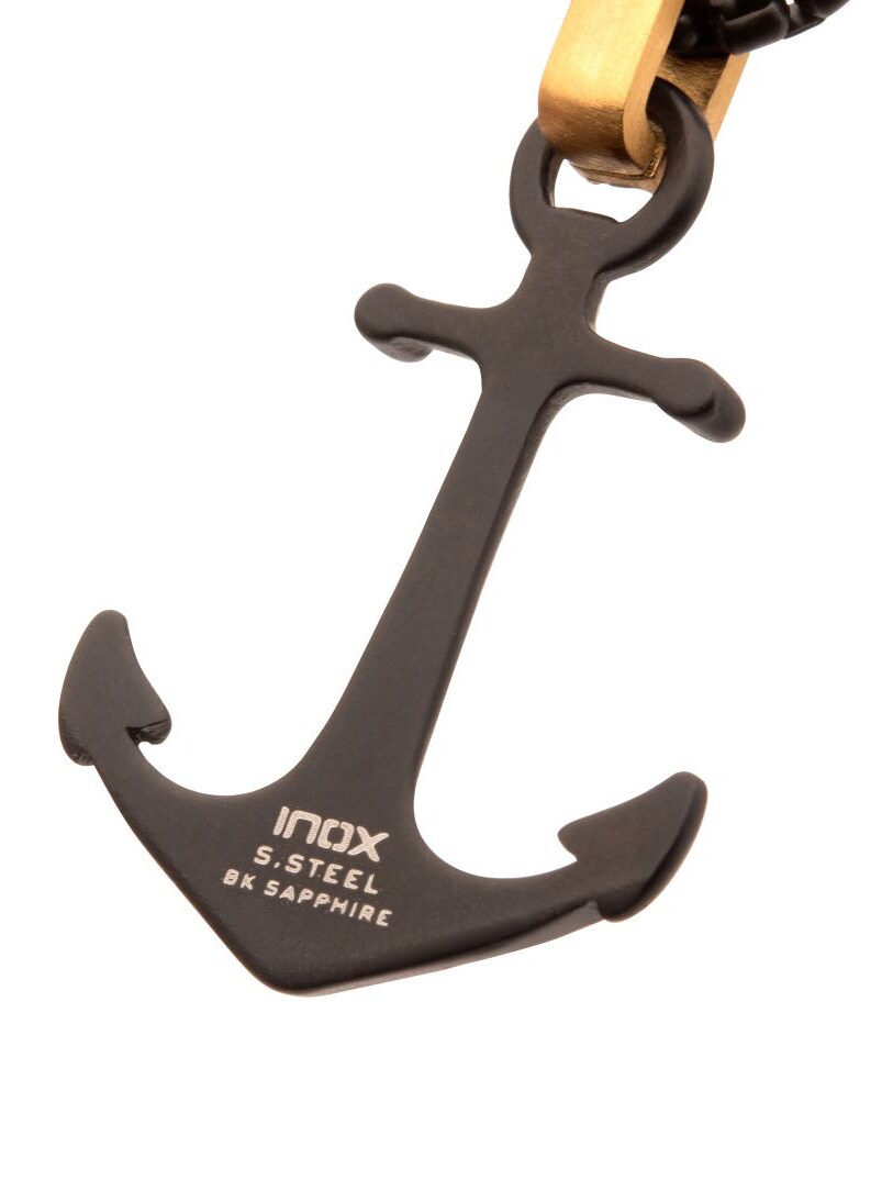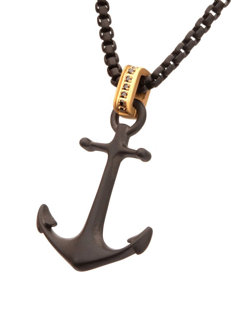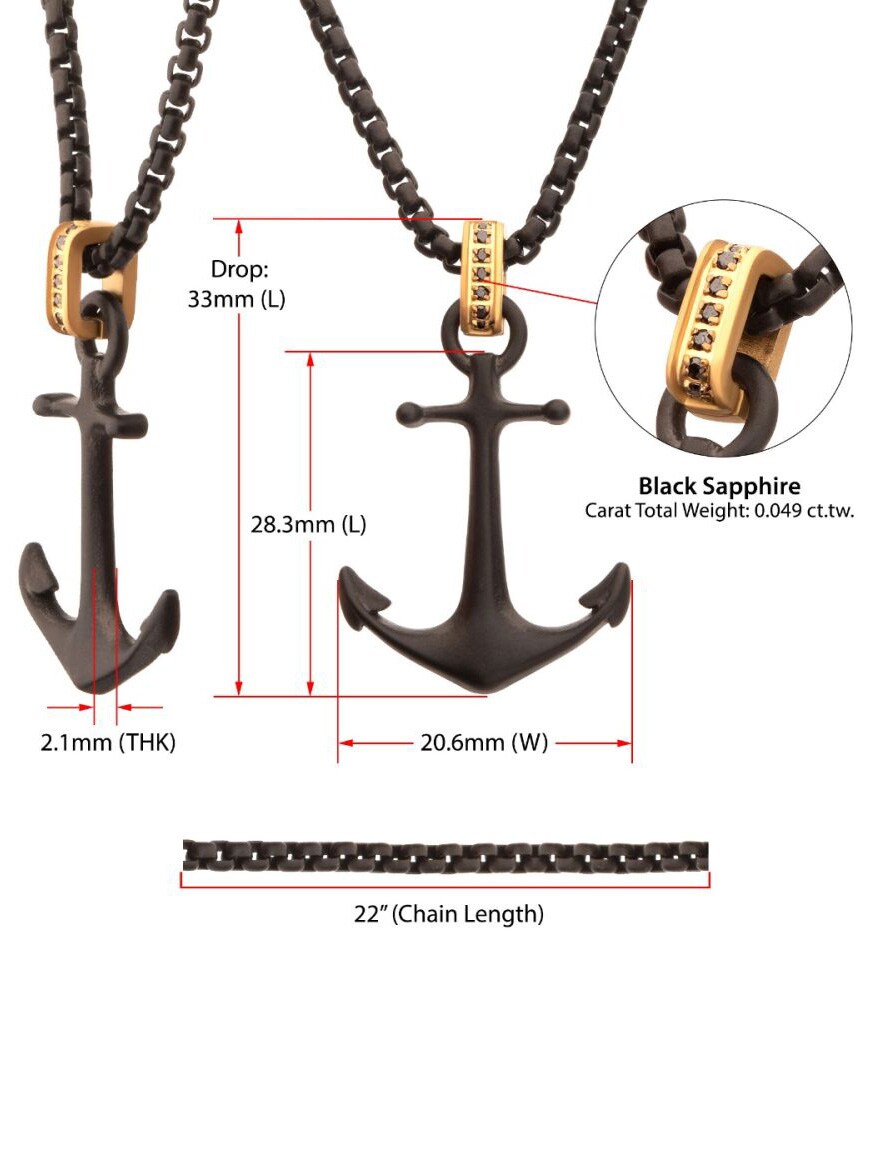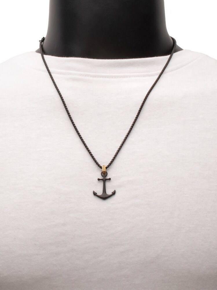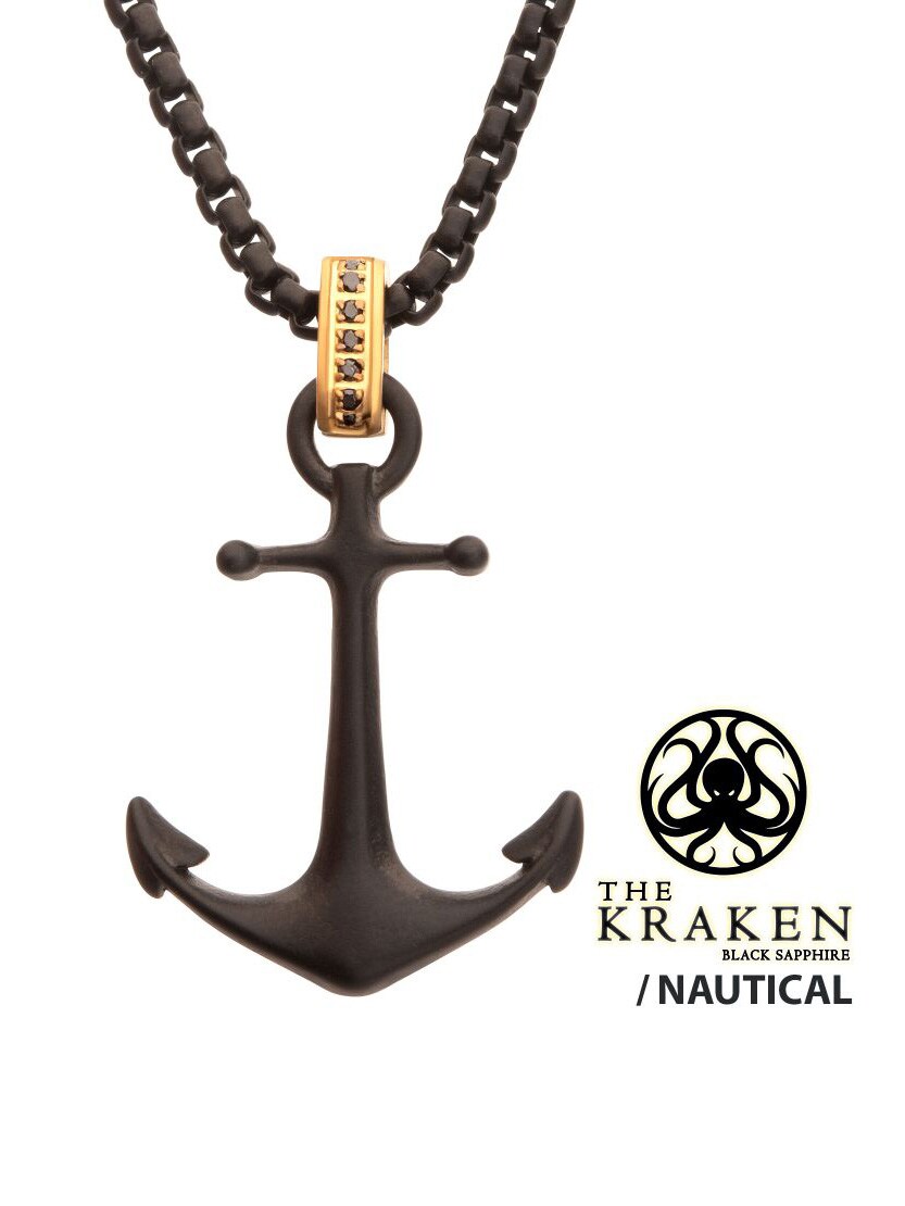 Halskjede med kjede og anheng i svart IP-stål og matt finish. Kraken-anker med et gyllent glimt av svart safir i løkken. Laget i rustfritt stål.
