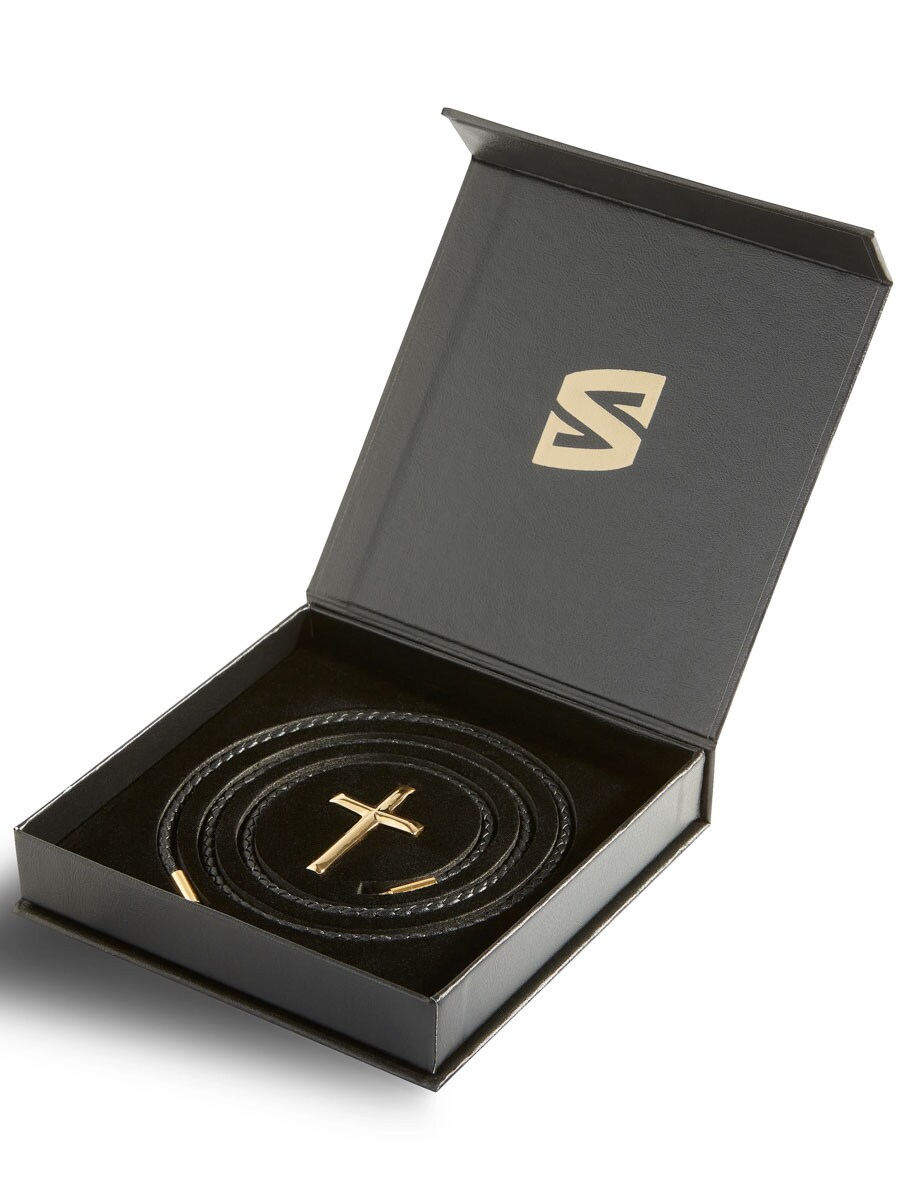 Et stilrent halskjede med flettet svart lær og et elegant korsanheng i polert rustfritt stål. Det lukkes enkelt med en twist-lås som sitter sikkert uten å skape trykkpunkter. Lærremmen er også smal nok til at du lett kan tre på andre anheng – perfekt hvis du liker å variere stilen din. Et komfortabelt og tidløst tilbehør for alle anledninger.