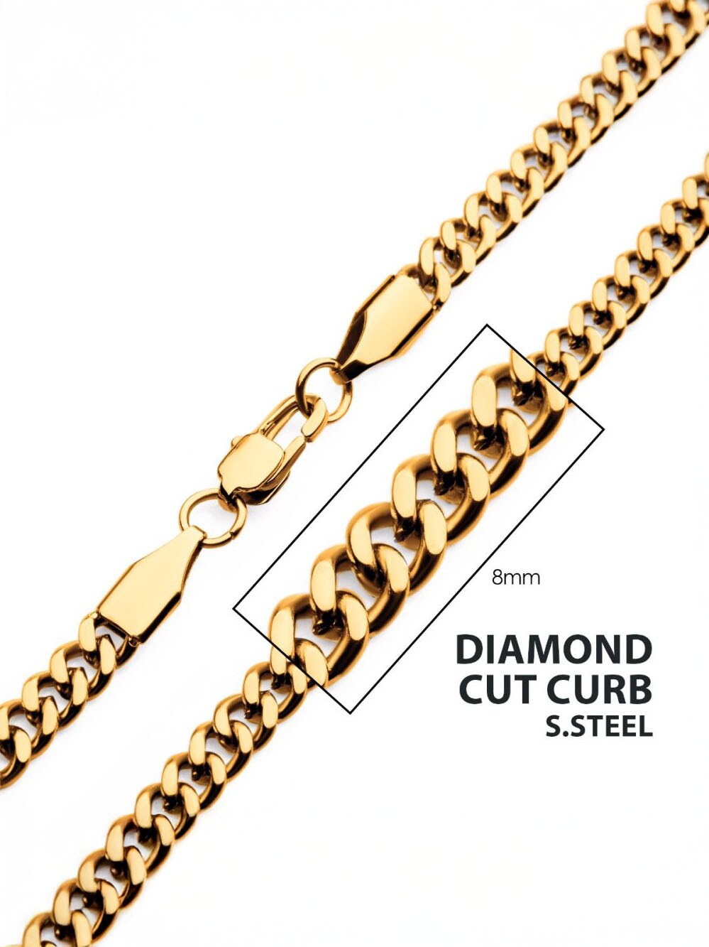 Curb-kjede fra Inox med 18K-belegg. Det har en diamantfaset finish og er laget av rustfritt stål. Robust og slitesterkt, perfekt til hverdagsbruk eller spesielle anledninger.