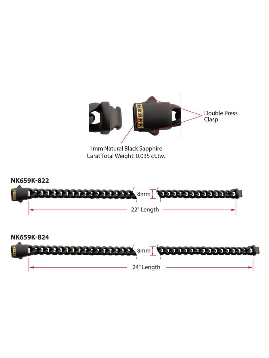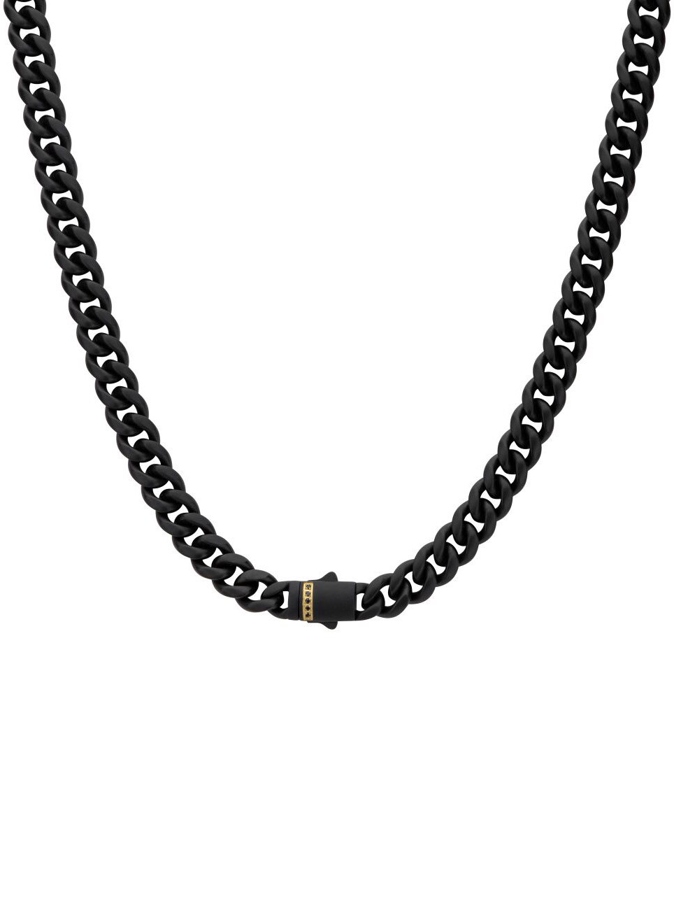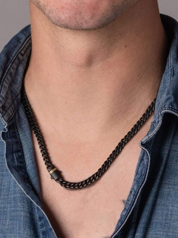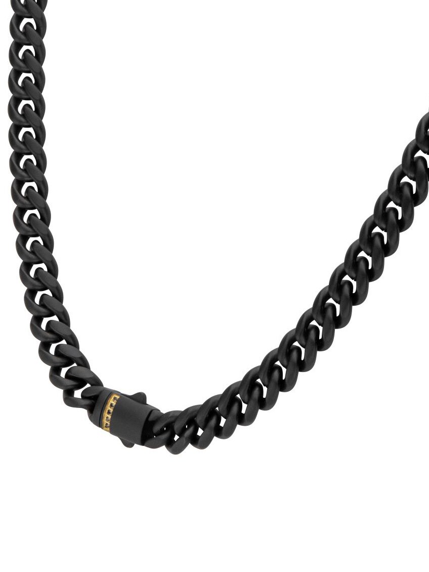Kubansk kjede fra Inox med svart IP-belegg og matt finish. Låsen er prydet med svarte safirsteiner innfattet i en eksklusiv 18K gullbelagt dobbelt foldelås som gir både sikkerhet og en luksuriøs detalj.