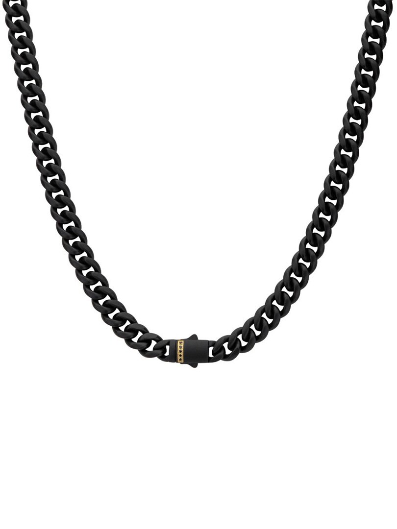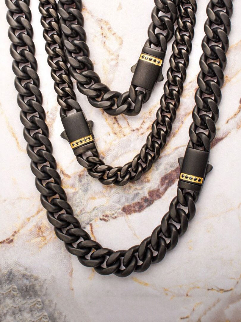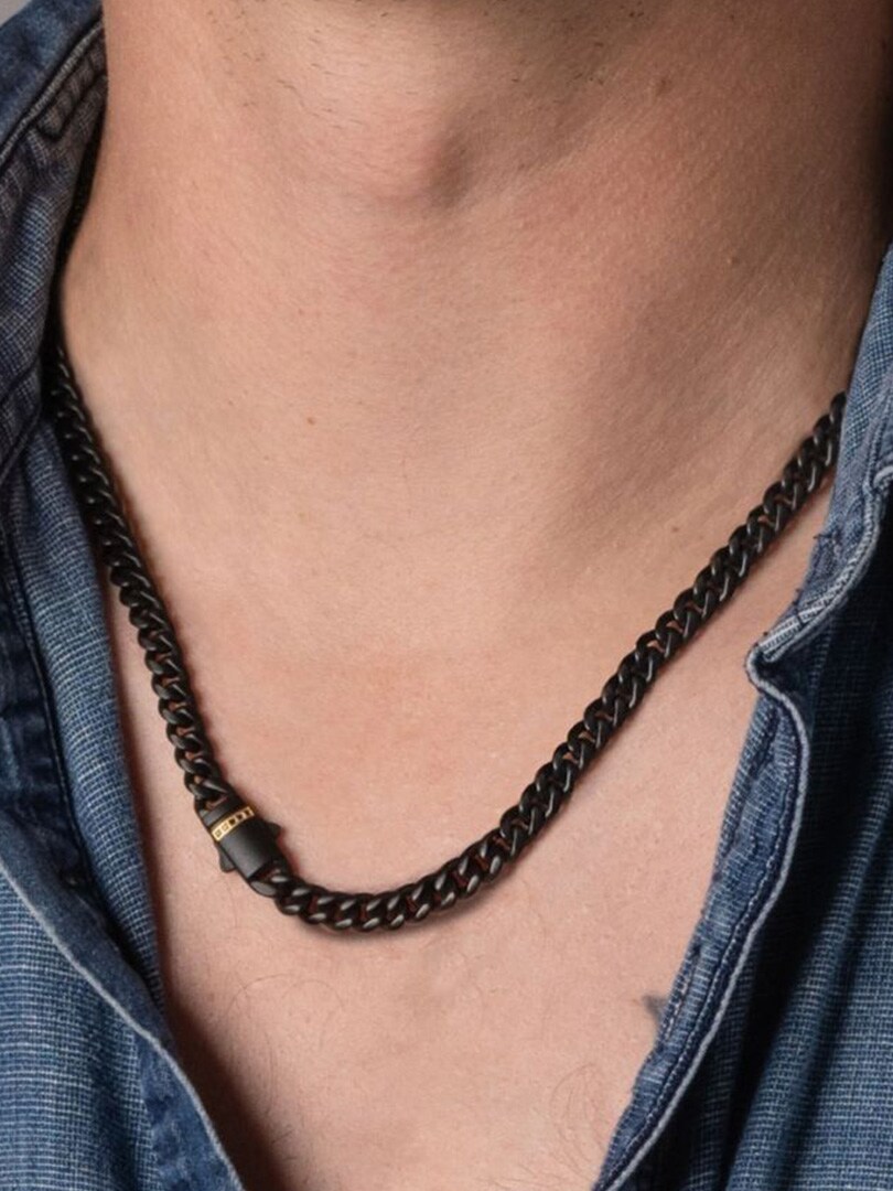 Kubansk kjede fra Inox med svart IP-belegg og matt finish. Låsen er prydet med svarte safirsteiner innfattet i en eksklusiv 18K gullbelagt dobbelt foldelås som gir både sikkerhet og en luksuriøs detalj.