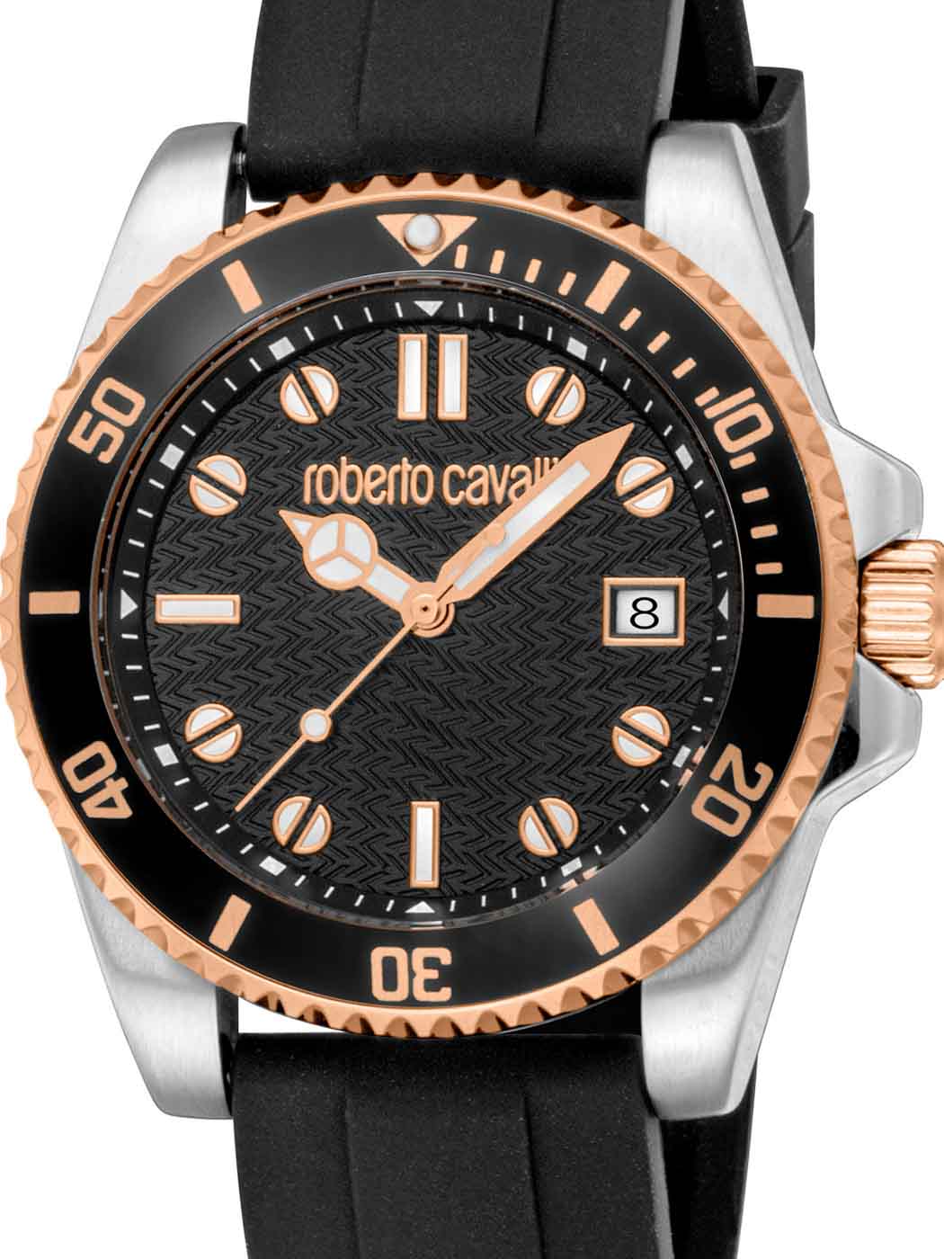 Sporty, men stilfull klokke med roterende lunette og datovindu. Den robuste urkassen i rustfritt stål er matchet med en svart silikonrem for høy komfort under aktiv bruk. Vannbestandig ned til 50 meter.