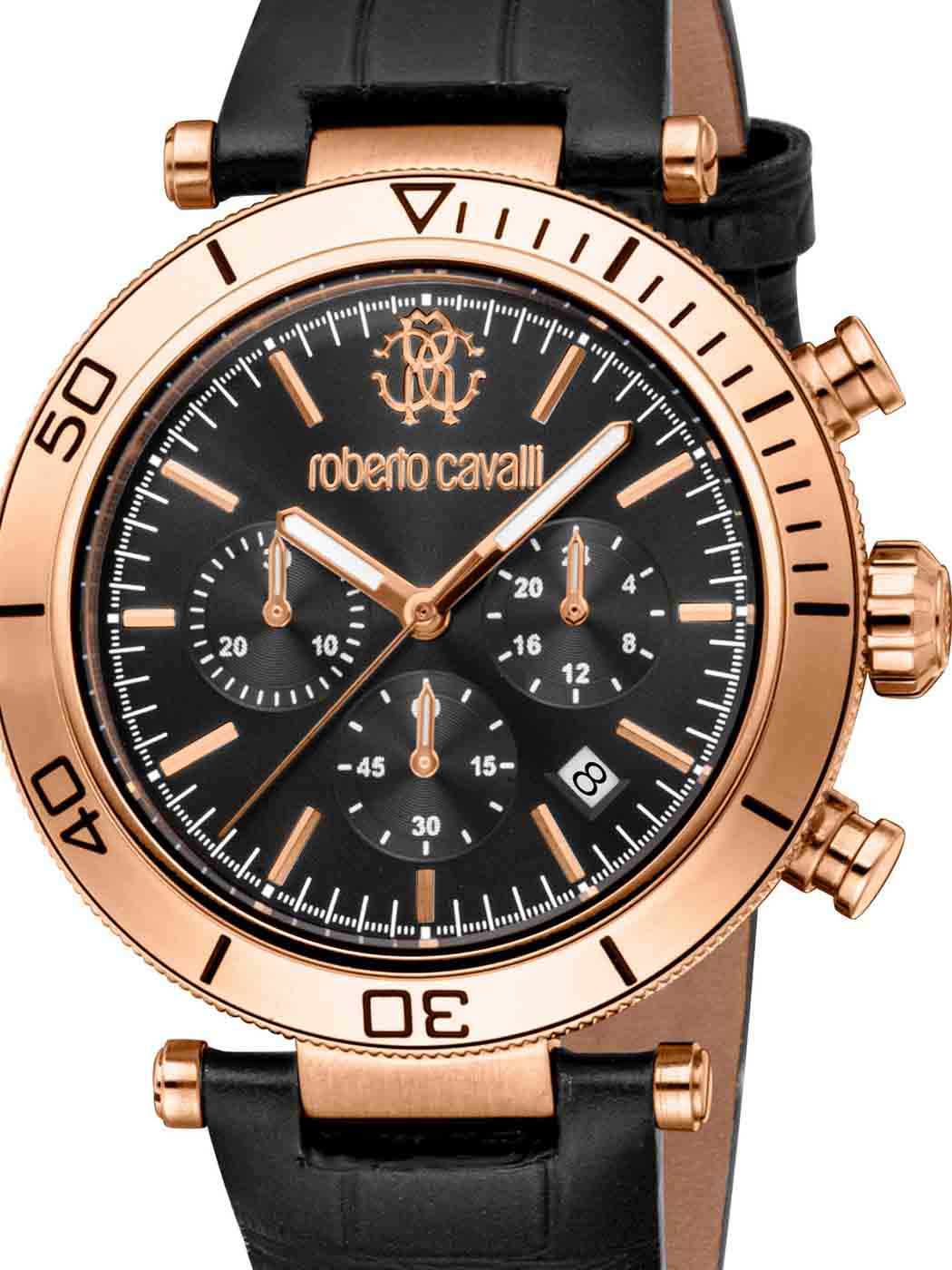 Svart klokke med roségullfarget stål. Kronograffunksjon, datovisning og tre underdisplayer gir teknisk presisjon. Den svarte lærremmen i reptilpreget design forsterker følelsen av klasse og eleganse. Vannbestandig opp til 100 meter.