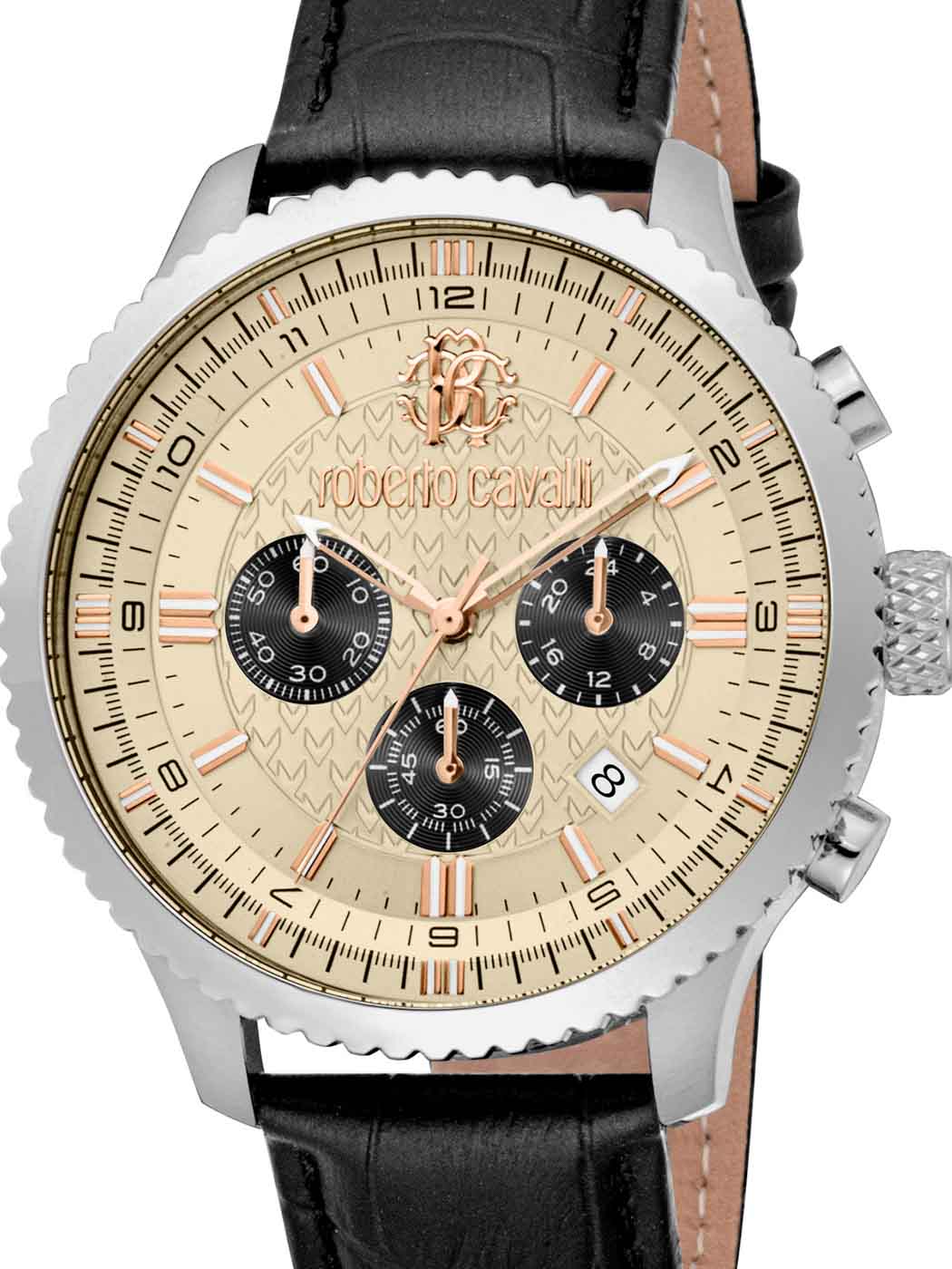 Elegant klokke med presist kvartsurverk, kronograf og stoppeklokke. Den svarte lærremmen i reptilpreget design forsterker følelsen av klasse og eleganse. Vannbestandig ned til 100 meter.