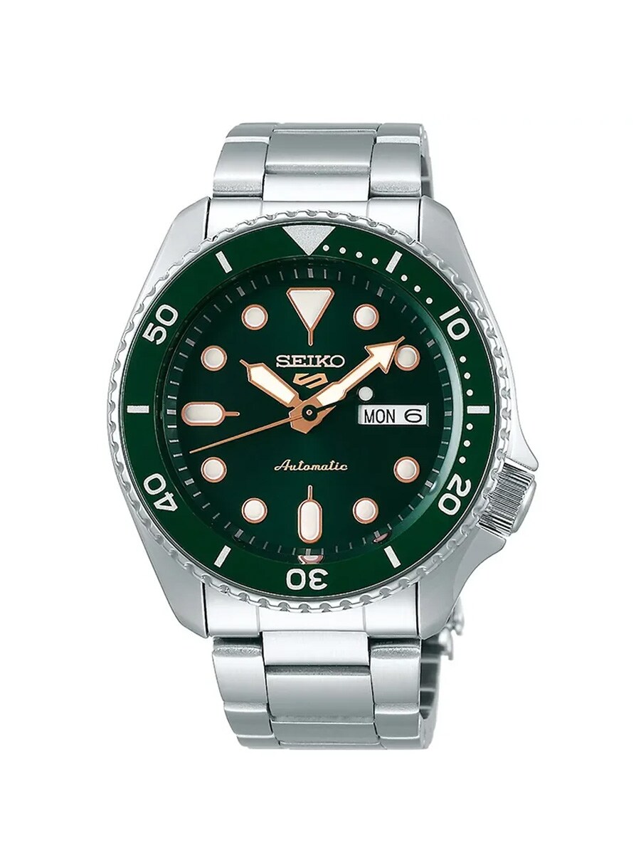 Seiko 5 Sports SRPD63K1 er en eksklusiv herreklokke som utmerker seg med sin dypt grønne urskive og elegante visere i roségull. Klokken drives av et automatisk urverk som lades opp av dine bevegelser, noe som betyr at ingen batteribytte er nødvendig. Den robuste kassen og lenken i rustfritt stål kompletteres av et slitesterkt Hardlex-glass og en tydelig dag- og datovisning. Med en vanntetthet på 100 meter er denne modellen konstruert for å klare både hverdagens utfordringer og sporty aktiviteter. En perfekt kombinasjon av sporty funksjonalitet og sofistikert stil for den moderne mannen.