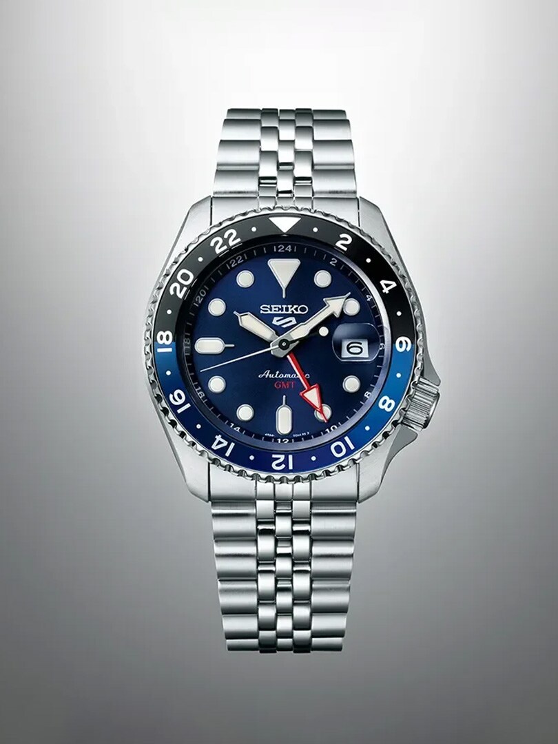 Seiko 5 Sports GMT SSK003K1 er en funksjonell automatisk klokke utstyrt med en praktisk GMT-viser for visning av en andre tidssone. Den elegante blå urskiven med sunburst-effekt matches av en dreibar ring i svart og blått, og beskyttes av et robust Hardlex-glass med forstørrelseslinse. Klokken har en robust urkasse i rustfritt stål og en komfortabel femsifret lenke som gir en sofistikert følelse. Med tydelige selvlysende indekser og en gjennomsiktig bakside som viser urverket, kombinerer den stil med mekanisk presisjon. Takket være 100 meters vanntetthet er modellen en utmerket følgesvenn for både reiser og hverdag.