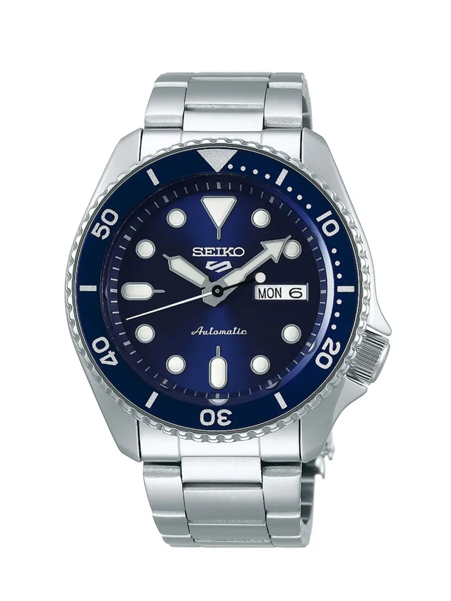 Seiko 5 Sports SRPD51K1 er en sporty automatisk herreklokke som kombinerer tidløst design med moderne funksjonalitet. Den dypblå urskiven med sunburst-effekt og matchende vridbar ring gir en elegant kontrast mot urkassen og lenken i rustfritt stål. Klokken har tydelig dag- og datovisning ved klokken tre samt LumiBrite-visere for optimal lesbarhet i mørket. Med et robust Hardlex-glass og 100 meters vanntetthet er den bygget for å tåle både hverdag og aktiviteter. Det pålitelige automatiske urverket 4R36 kan beundres gjennom den gjengede glassbaksiden.