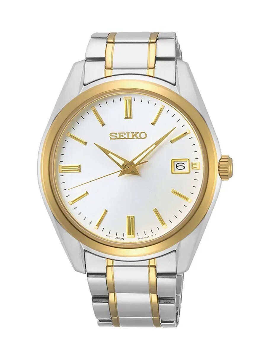 Seiko SUR312P1 er en sofistikert herreklokke i rustfritt stål med et elegant tofarget design i sølv og gull. Den hvite urskiven fremhever de gullfargede viserne og indeksene, samt den tydelige datovisningen ved klokken tre. Klokken beskyttes av et ripefritt safirglass som sikrer langvarig klarhet og holdbarhet. Med en vanntetthet på 100 meter og et presist kvartsurverk er modellen både pålitelig og stilsikker for daglig bruk. Denne klokken tilbyr en tidløs estetikk som passer perfekt til både formelle og avslappede anledninger.