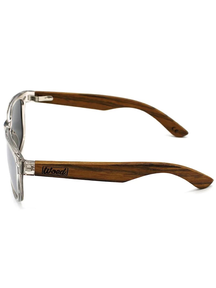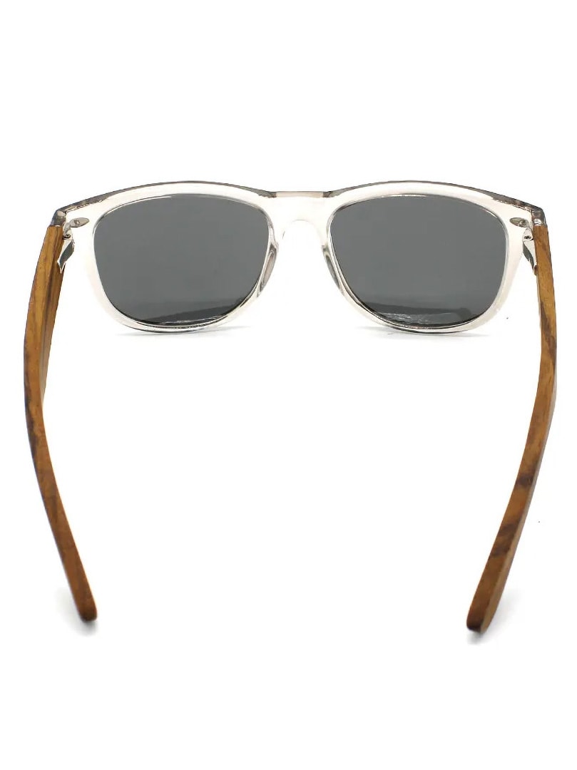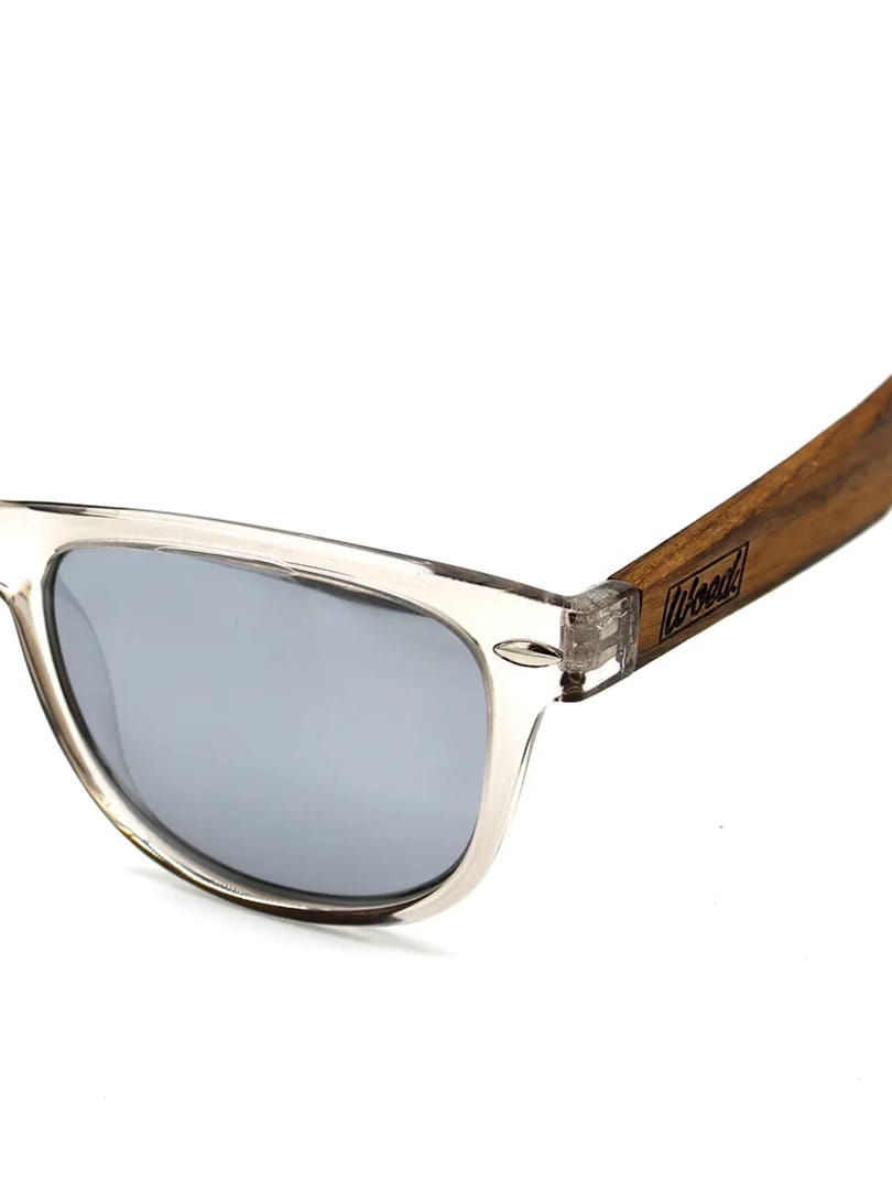 Solbriller i wayfarer-modell med transparent innfatning og stenger i ekte tre. Solbrillene er utstyrt med UV400-polariserte linser som beskytter mot solen og reduserer forstyrrende refleksjoner. Leveres med pusseklut og praktisk oppbevaringspose.