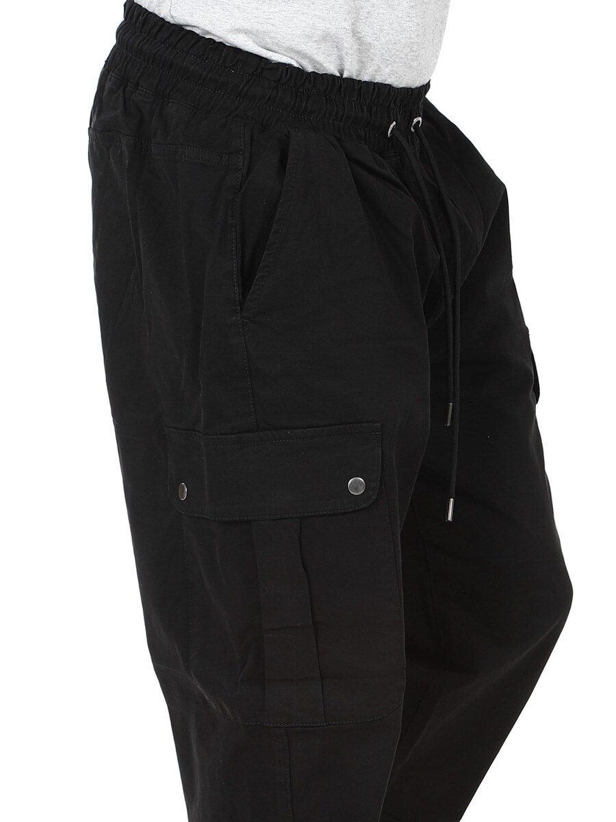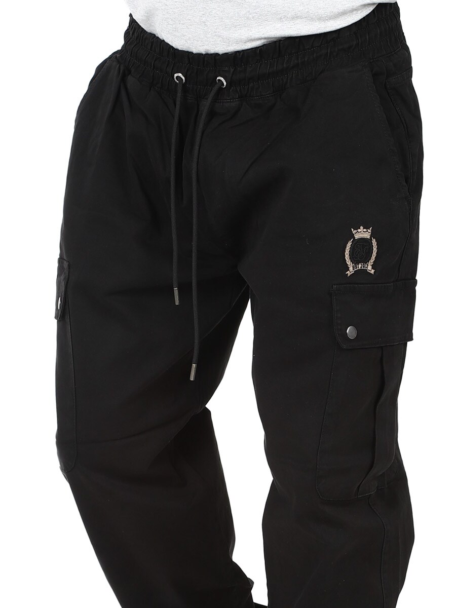 Svarte bukser utstyrt med flere praktiske lommer som gir både stil og oppbevaring. De har elastisk midje, justerbar snøring i bensluten samt en brodert logo på låret. Perfekte for en avslappet streetwear-look eller til hverdagsbruk.