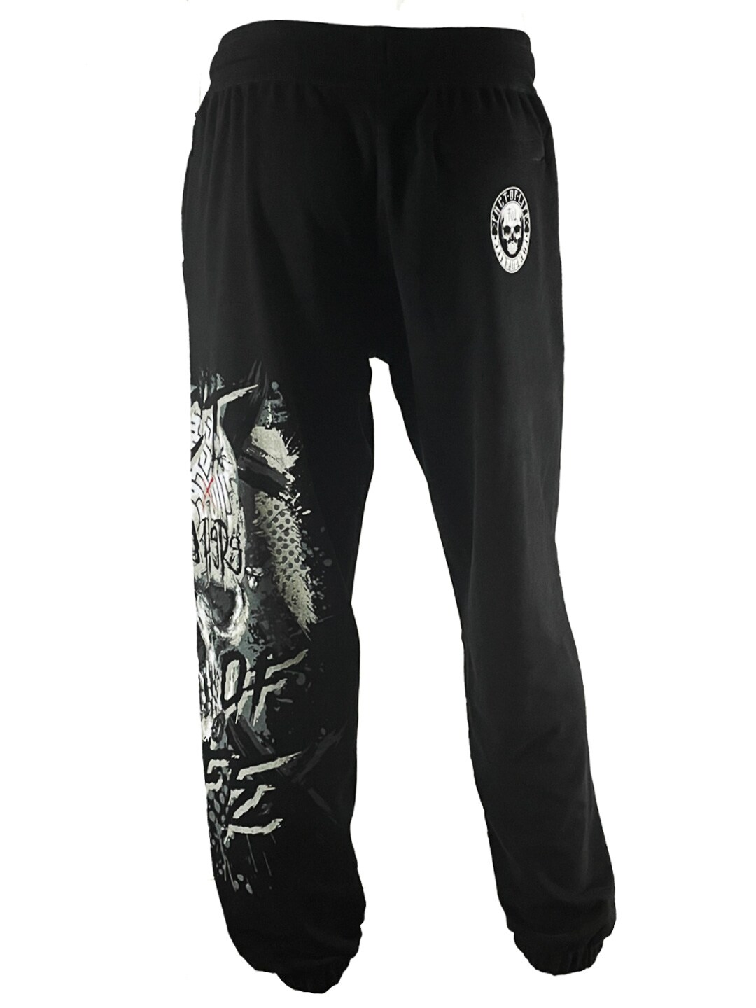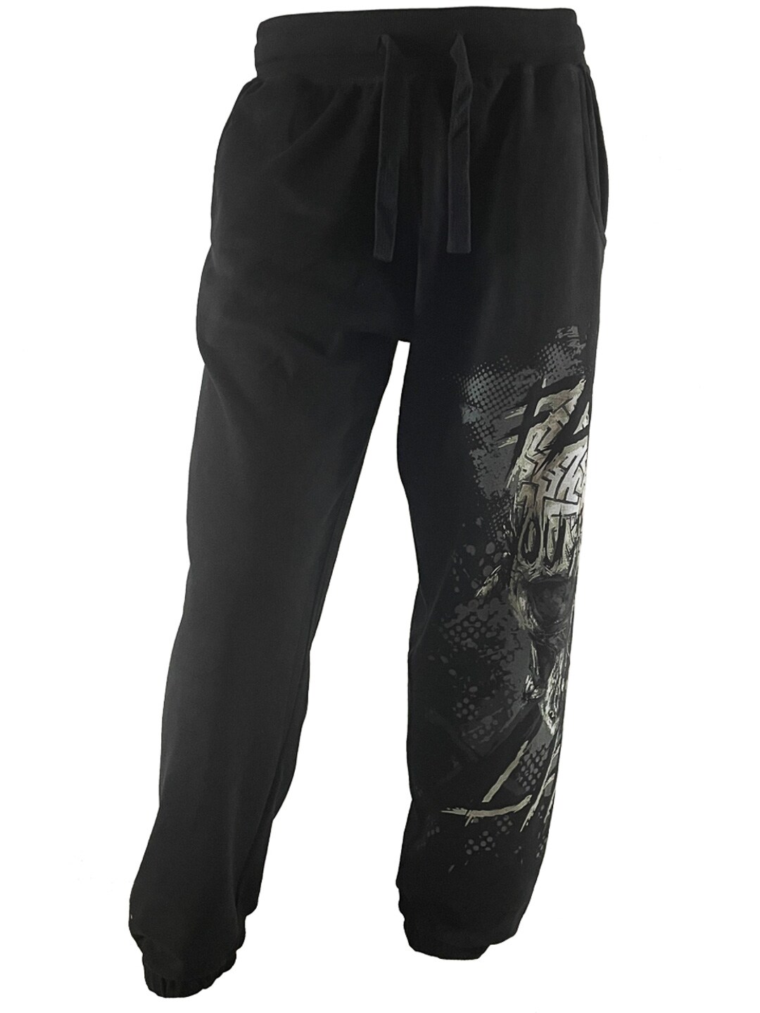 Komfortable sweatpants med et tøft og uttrykksfullt design. Den svarte basen kombineres med et stort grafisk trykk langs det ene benet, noe som gir buksene en tydelig street- og rockefølelse. Modellen har strikk i midjen og ved anklene for en behagelig passform, samtidig som sidelommene gjør dem praktiske i hverdagen. Perfekte for deg som vil ha myke bukser med attitude og et motiv som virkelig skiller seg ut!