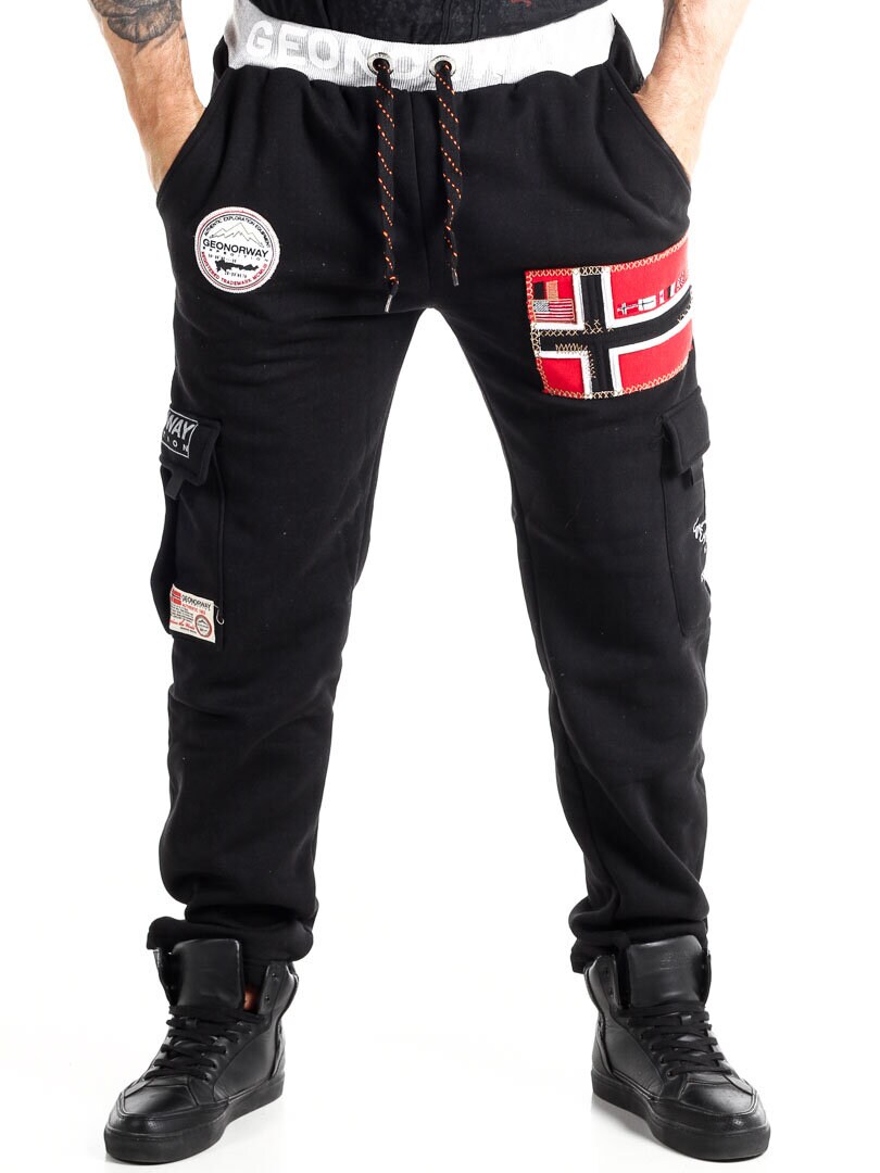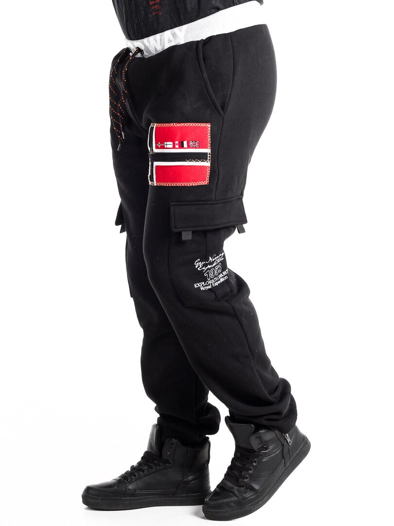 Unik cargobukse med teksttrykk og broderte flagglapper. De har to åpne lommer foran og to sidelommer med borrelås. Designet med rette ben, børstet innside og ribbestrikkede mansjetter med snøring i livet.